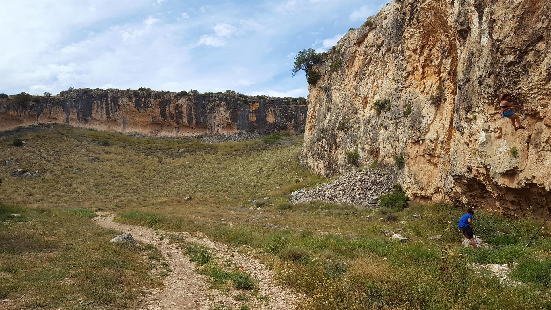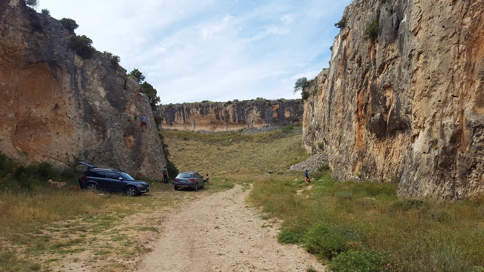 Continuando la marcha y justo casi al final del cañón, nos encontramos con un par de coches. Son de gente que está escalando. Tanto en la pared de la derecha como en la de la izquierda. Están en silencio. Concentrados. Saludamos y continuamos. Son las únicas personas que hemos visto en horas.