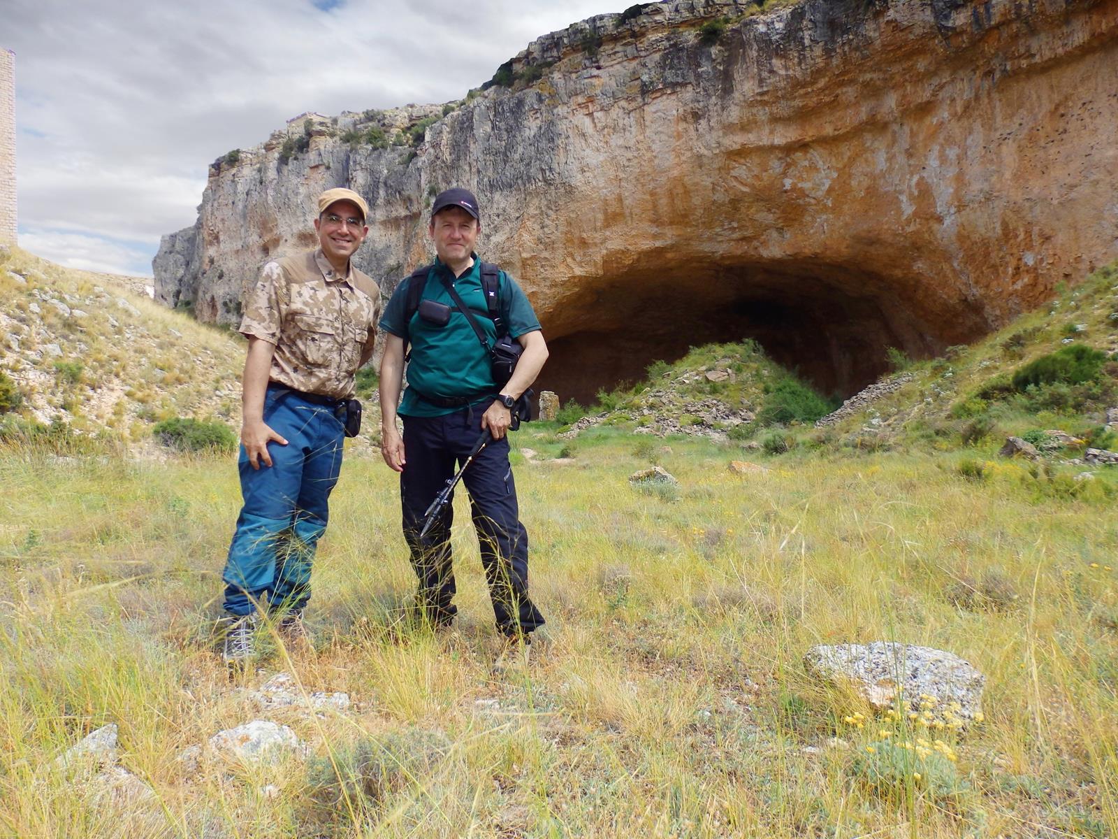 Es la llamada Cueva Madre. Es impresionante. Nos metemos dentro. Parece una catedral, por la altura del techo. Pongo de nuevo el trípode en una piedra grande que hay cerca. Con el zoom encuadro a Ángel. Otros doce segundos, y el disparador automático. Voy corriendo o no saldré en la foto. El resultado ya se puede ver. Somos dos pulgas en medio de la pared caliza. ¿Cómo pudo hacer el agua semejante hueco? Alucinante.