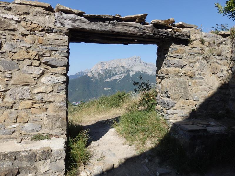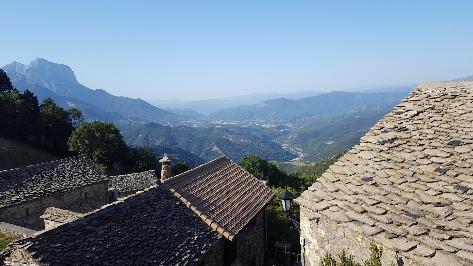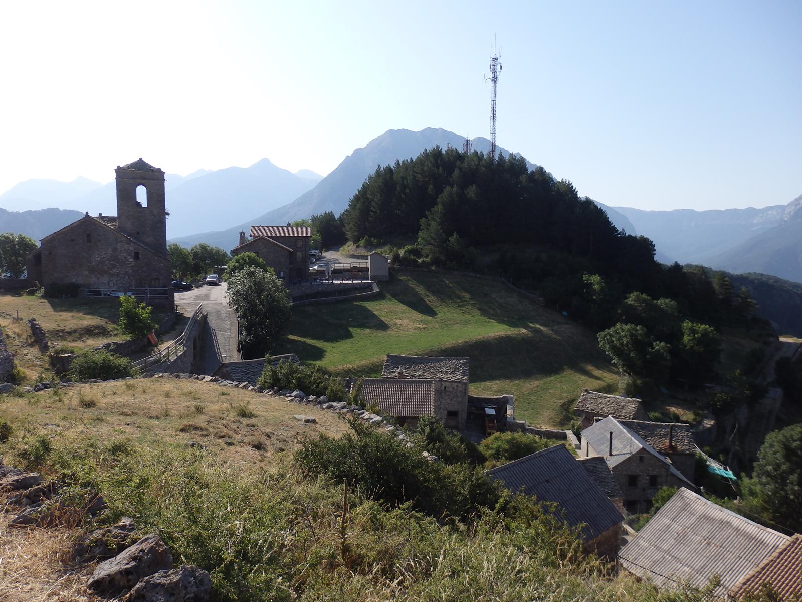 Comienzo a caminar. A mi izquierda hay prados y casas con sus típicos tejados, la mayoría hechos a base de losas de piedra y pizarra. Más allá, el horizonte. Es inmenso, si diriges la vista hacia allí, como a vista de pájaro, en un lugar destacado se ve la Peña Montañesa (2.295 m). Este pueblo tiene unas vistas impresionantes. Sigo caminando hasta una loma.