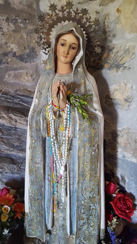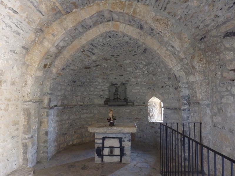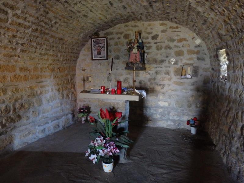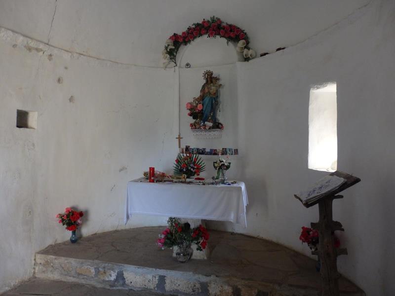 Como la otra ermita, pienso que tendría que estar abierta. Tiene también una gran puerta de madera. La empujo y…no se abre. Empujo más. Cede pero está como atascada. Sigo empujando y con bastante esfuerzo logro abrirla. El interior aparece ante mis ojos. Es diferente pero igual de austero, con un altar y una hornacina donde hay una imagen de la Virgen María, y algunas flores pero lo que la diferencia de la otra es que las paredes están cubiertas de estuco blanco, lo que le da un aspecto más moderno, a mí me gusta más la piedra. Le echo un vistazo y salgo.