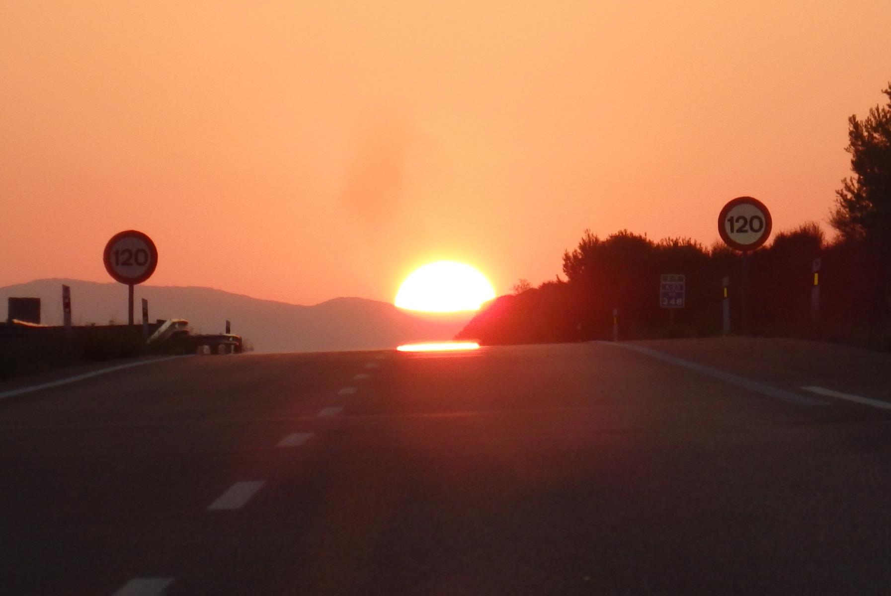 Voy a explicar bien la ruta por si alguien se anima a repetirla. Lo primero es llegar a Huesca desde Zaragoza. Voy por la autovía A-23. A las 7:05 estoy a 10 km de Huesca y un bonito amanecer me da los buenos días. El sol sale como una gran bola naranja detrás de las montañas que constituyen las Sierras Exteriores del Pirineo.