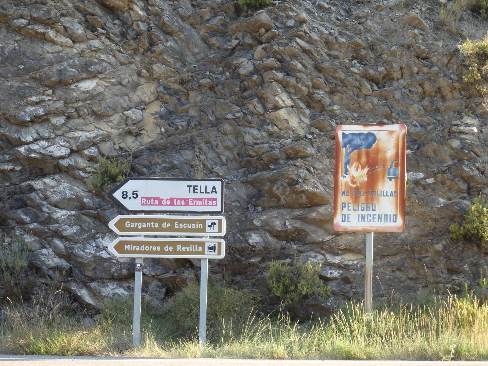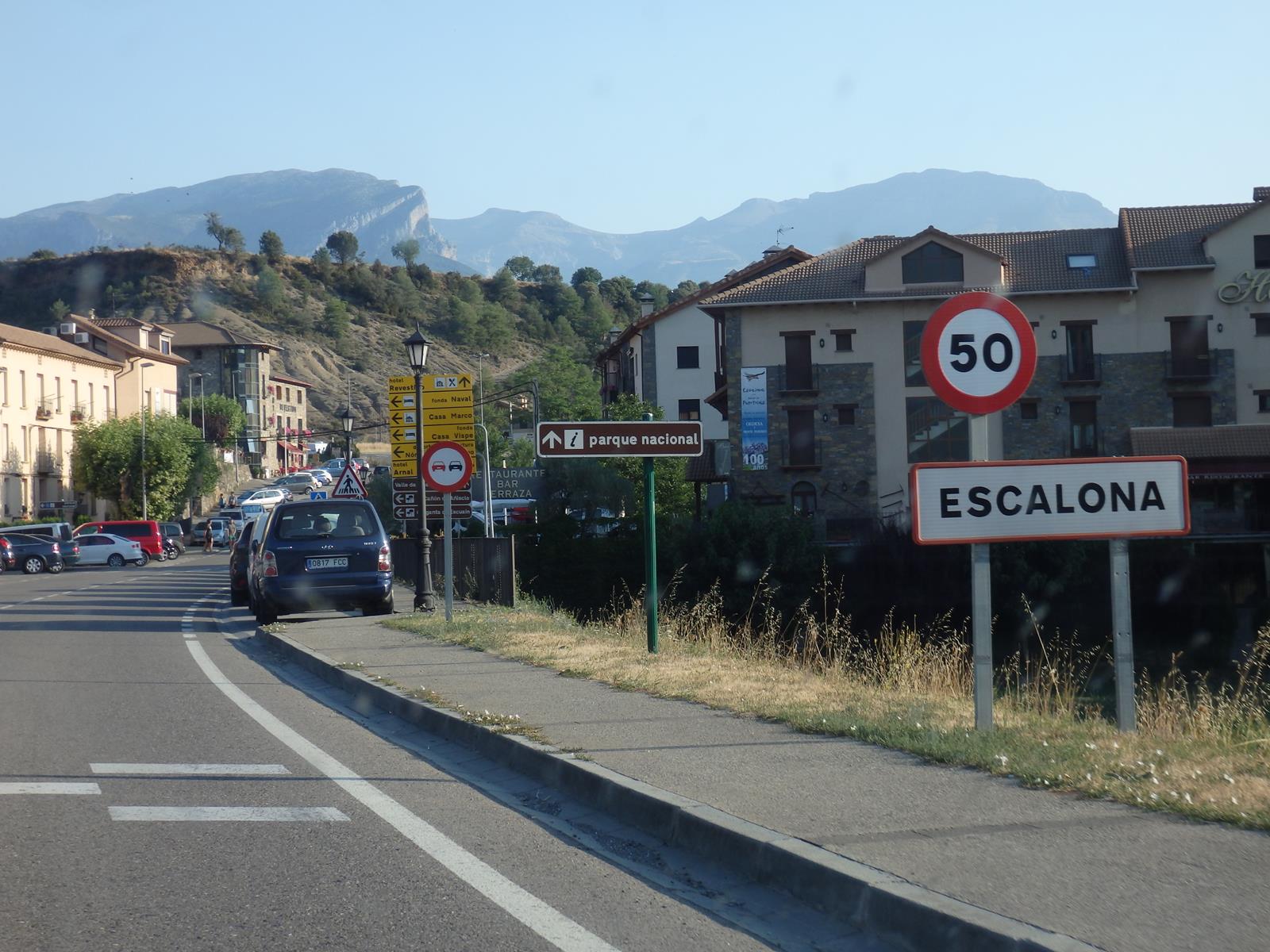 Cuatro kilómetros después y ya estoy en Labuerda. Cruzo el pueblo. Veo el Hotel-Restaurante Turmo y la solitaria torre de la iglesia. Son las 8:30. Continúo. En la lejanía ya veo el pueblo de Tella allí en lo alto. Es mi destino. Cinco minutos después y con 195 km cruzo el puente sobre el río Bellós y entro en la localidad de Escalona. A la izquierda, en una rotonda al salir del pueblo hay un cartel que indica la dirección al cañón de Añisclo. Tomaré esta dirección más tarde, cuando vea las Ermitas de Tella, en la segunda parte de la excursión. De momento sigo hacia Tella.