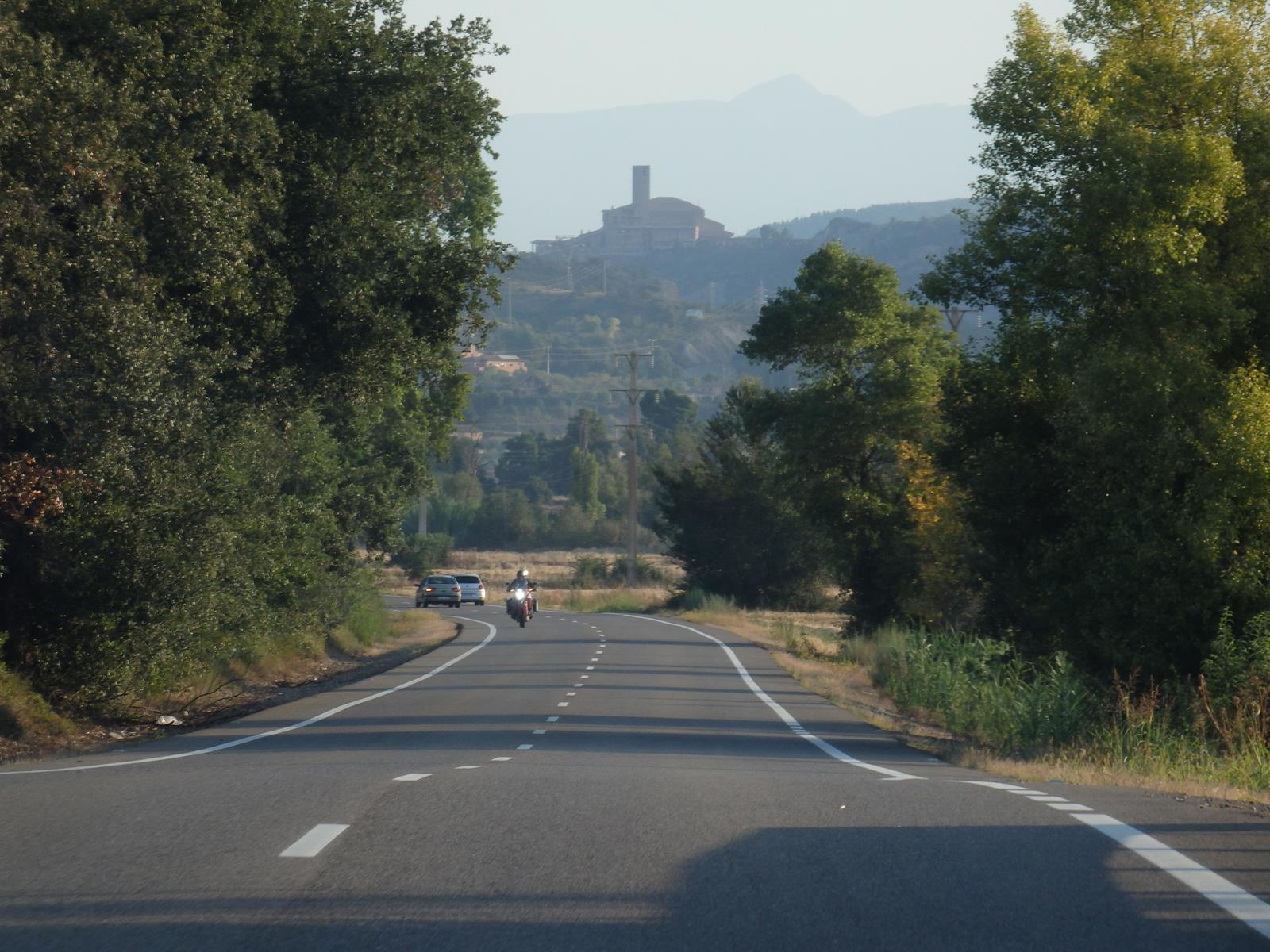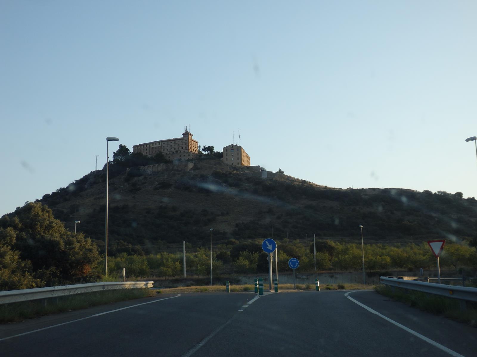 Son las 7:11 y ya estoy en Huesca después de unos 74 km desde mi casa. Ahora tomo el desvío que va hacia Barbastro, abandonando la autovía y circunvalando Huesca. Por un tramo de doble sentido llego a una rotonda, unos diez minutos después, que me permite incorporarme a otra autovía, la A-22. A las 7:38 minutos y 115 km desde que salí de Zaragoza, ya puedo ver en la lejanía una la silueta que se recorta contra el horizonte. Es el Monasterio del Pueyo, en lo alto de una colina. Barbastro está ya muy cerca. Al rato el Monasterio se hace grande a la vista y justo allí hay una rotonda por la que se sale de la autovía. Si siguiéramos por esta última, iríamos a Lérida.