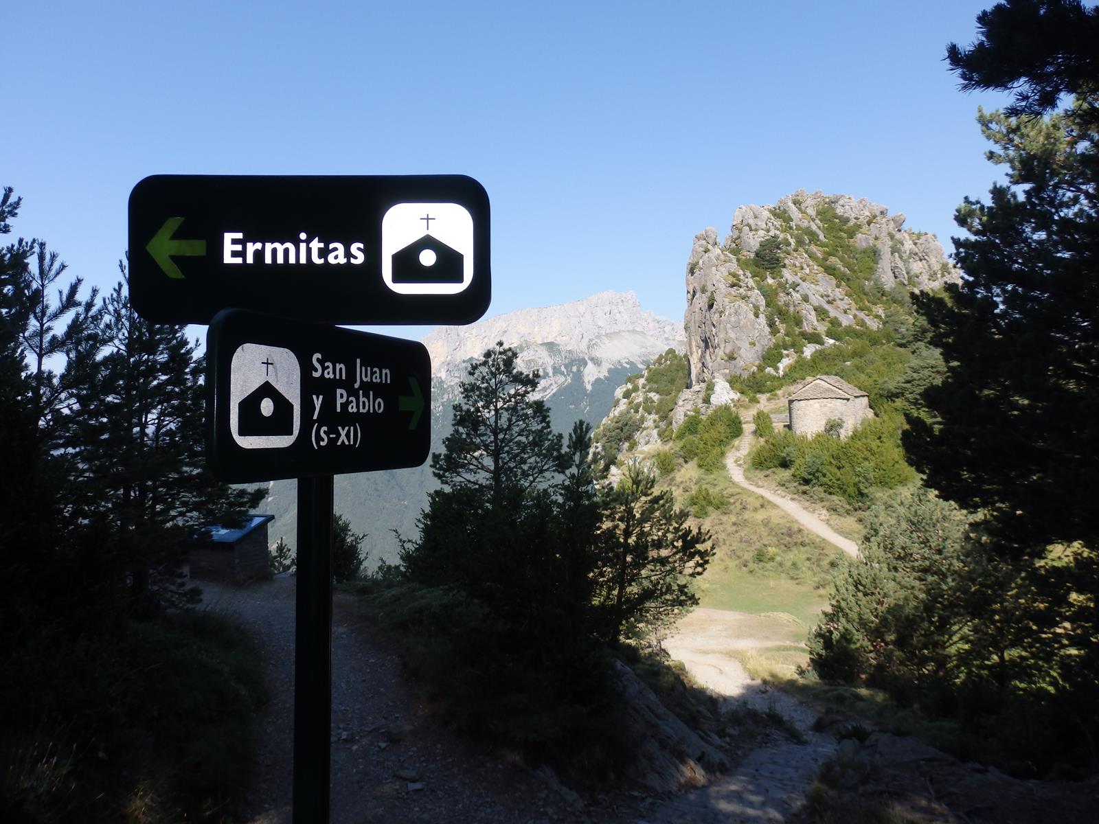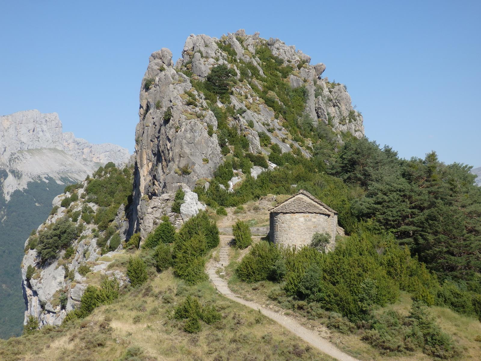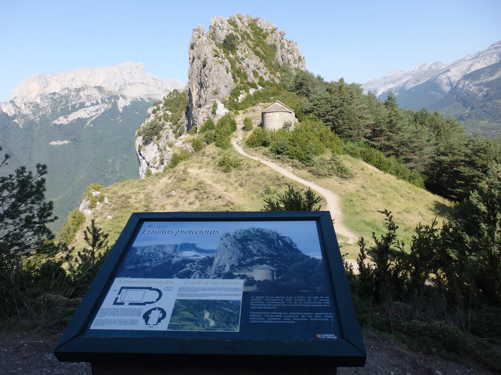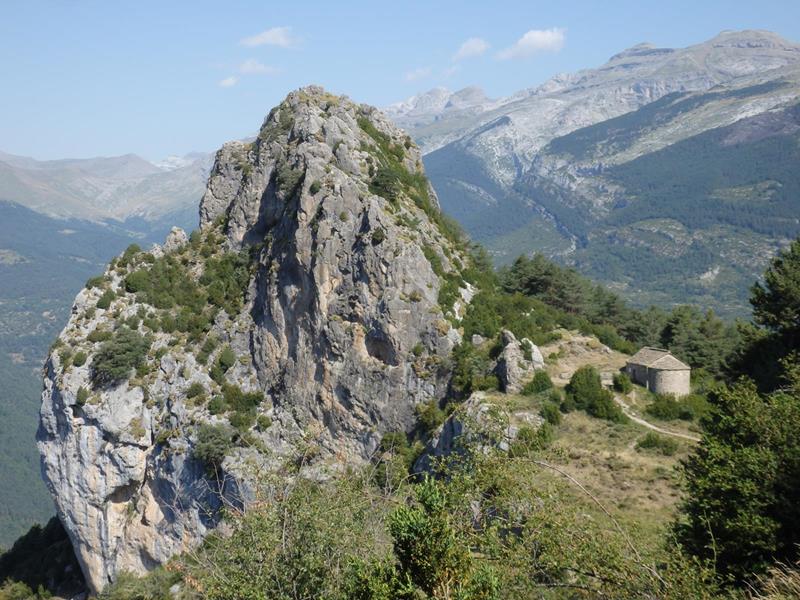 Cuando ya salgo del bosque, lo primero que me encuentro es una visión realmente bella. Un picacho de roca, que es un saliente rocoso de la Peña de San Juan, y a sus pies la primera de las ermitas. Es la de los Santos Juan y Pablo. Las vistas son increíbles. Se pueden ver las gargantas de Escuaín, el valle del Cinca, la gran mole rocosa del Castillo Mayor. No me extraña que eligieran esta ubicación. Aunque otros dicen que la elección fue por otros motivos que luego explicaré y totalmente intencionada.