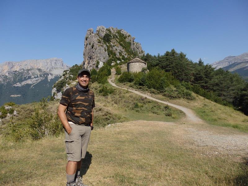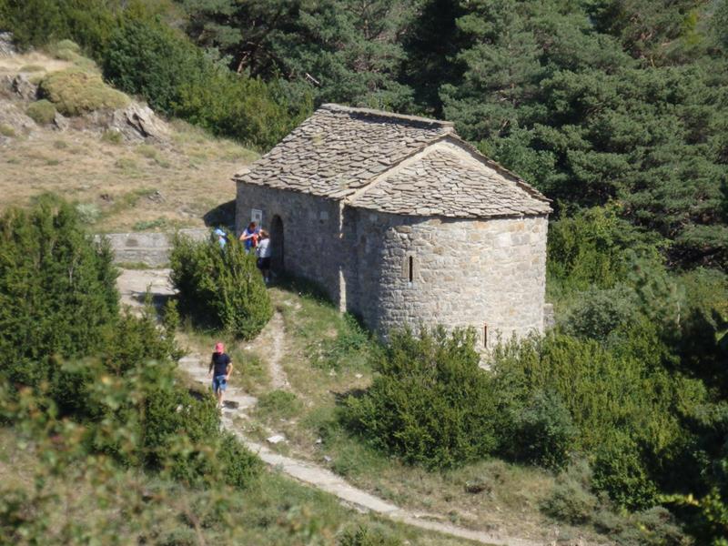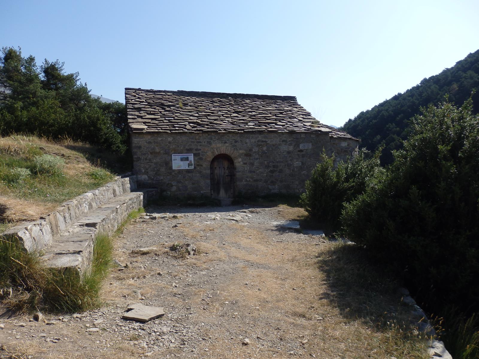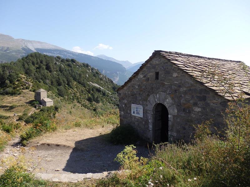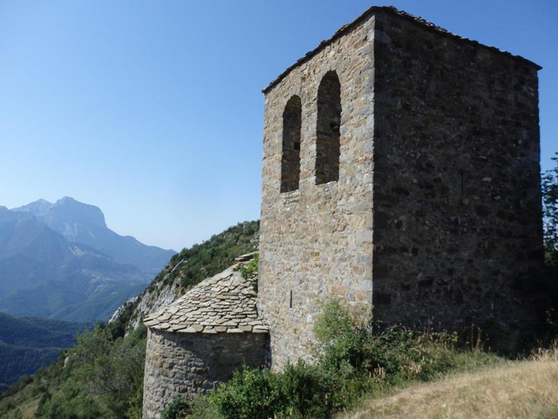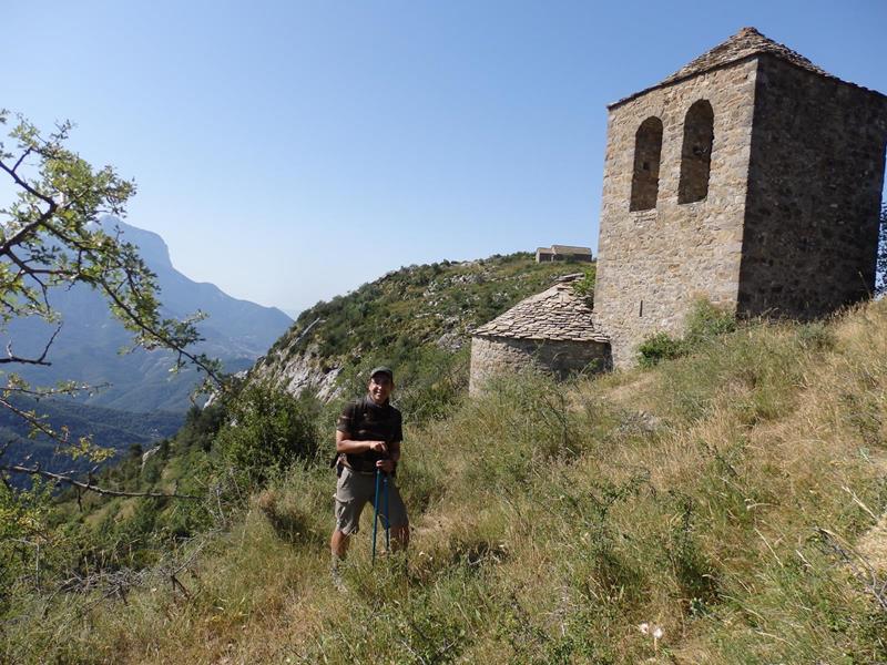 Cuando ya salgo del bosque, lo primero que me encuentro es una visión realmente bella. Un picacho de roca, que es un saliente rocoso de la Peña de San Juan, y a sus pies la primera de las ermitas. Es la de los Santos Juan y Pablo. Las vistas son increíbles. Se pueden ver las gargantas de Escuaín, el valle del Cinca, la gran mole rocosa del Castillo Mayor. No me extraña que eligieran esta ubicación. Aunque otros dicen que la elección fue por otros motivos que luego explicaré y totalmente intencionada.