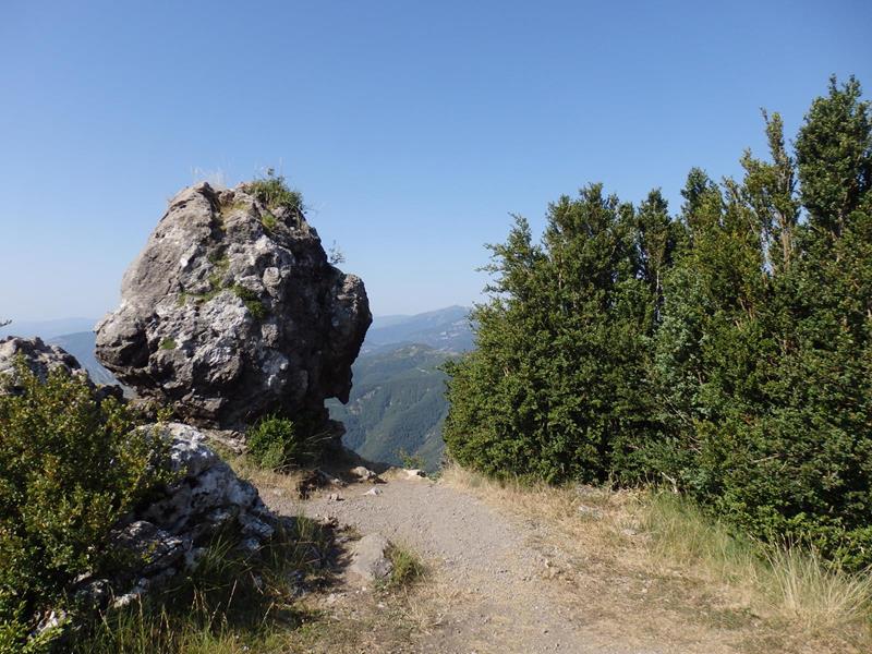 Terminada la visita al interior de la ermita, me voy. Salgo y avanzo un poco más hacia la zona de la roca, por encima de la construcción. Estoy más alto cada vez. Llega un momento en que no puedo avanzar más. La vegetación y el terreno me lo impiden. Existe la creencia popular que cuenta que en esta roca se hacían aquelarres, por eso también le llaman el Puntón de las Brujas. En el Pirineo siempre existen en diversos lugares este tipo de leyendas. Puede que para contrarrestar esta inclinación hacia todo lo esotérico y mágico en este lugar se fundaran y construyeran estas ermitas. Por eso decía antes que el motivo de ubicación pudiera ser este. Lo curioso es que en Tella no se ha conocido jamás este peñasco por ese nombre referido a las brujas. ¿En qué quedamos?.