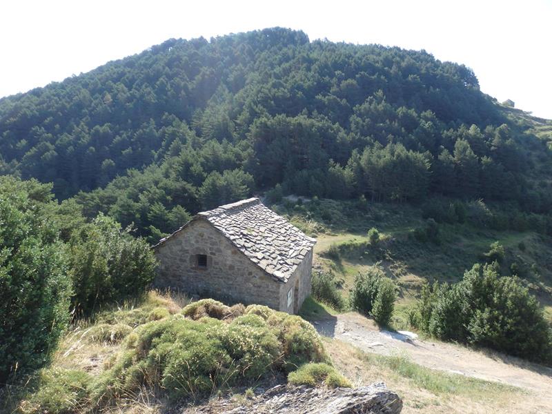 De pronto, tal y como me imaginaba por las voces que oía, de entre los árboles, en la zona que termina el bosque, aparece una familia numerosa al completo que lo invade todo. Pienso que se les tiene que escuchar en unos cuantos metros a la redonda pues arman mucho jaleo. Me fastidia, la verdad, acaban de romper el encanto del lugar, pero es inevitable, es 4 de agosto. Todo el mundo tiene derecho a estar en los sitios, igual que estoy yo. Tan pronto como puedo, les saludo y huyo del lugar hacia la siguiente ermita. Hay que retomar el camino y esta vez va de subida. Al principio atraviesa el bosque de pino royo por la ladera de la montaña. Después clarea y veo robles y algún prado. Las vistas sobre la ermita de los Santos Juan y Pablo, la Peña de San Juan y las montañas que me rodean es magnífica.