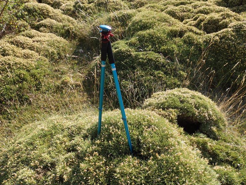 Me vuelvo otra vez por donde he venido y oigo voces. Ya están aquí. No iba a ser el único que estuviera visitando estos parajes. Bueno, al menos he disfrutado de un buen rato de soledad. No me puedo quejar. Aprovecho para hacerme alguna foto más sin gente que aparezca en el encuadre y que me estropee el plano. No tengo trípode grande, lo dejé en casa (es muy pesado e incómodo para las excursiones). Veo que por todos los lados hay erizones. Son esas plantas que parecen cojines verdes a ras de suelo. Improviso y apoyo ahí los dos bastones. Los uno por las cuerdas de agarre. Le pongo mi pequeño trípode articulado a la cámara y la sujeto. Se mantiene bien. Perfecto. Disparador automático y me hago un par de fotos antes de irme.