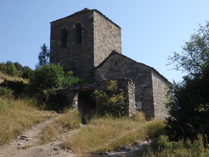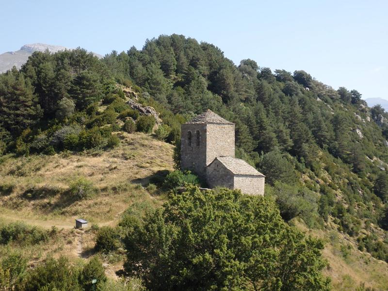 La ermita es de estilo románico del Sobrarbe, y tiene 1.000 años. Merece la pena detener el paseo, olvidarnos del reloj y dejarnos cautivar por el entorno. Me hago fotos como no podía ser menos, con ese fondo de postal y me dirijo a la ermita. Los Santos a los que está dedicada son dos, romanos, martirizados en Roma, en el año 362 d.C. Fueron decapitados por negarse a abjurar de sus creencias cristianas.