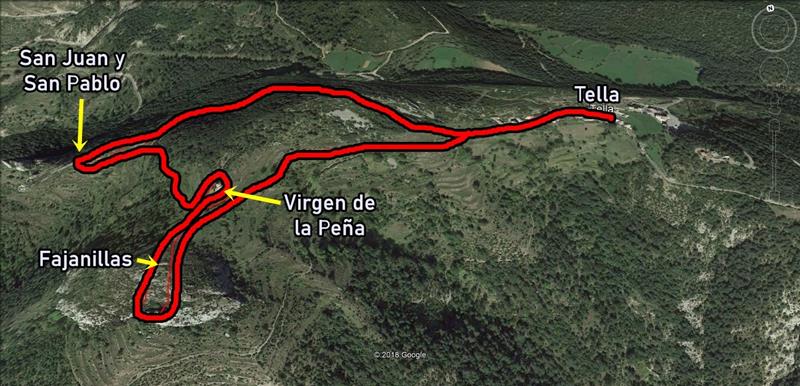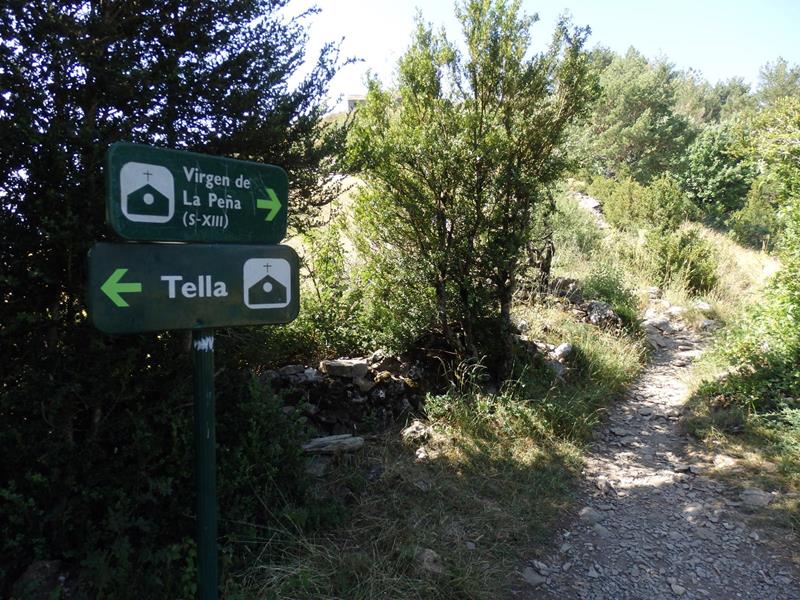 La Ermita de La Virgen de la Peña, se construyó en el siglo, XIII, aunque fue también restaurada en el XVI (parece que este siglo fue de bonanza para la zona por la cantidad de obras que se acometieron). Es de planta rectangular. Tiene una nave de bóveda de medio cañón, unida a la cabecera por un arco de medio punto. Desde ahí hay unas vistas magníficas de la otra ermita que acabo de visitar y del pueblo de Tella. Como en las otras, atravieso una puerta de madera y accedo al interior. Aquí si es de piedra, y parece en general mejor conservado. Hay una pequeña hornacina con la imagen de la Virgen de la Peña. Parece ser que en la guerra también sufrió grandes destrozos. Pero en el siglo pasado, en 1.983, se hicieron arreglos en la bóveda y en 1.995 fue totalmente restaurada. Todas estas ermitas son objeto de romerías a lo largo del año, cada una según el día del año en que caiga la festividad de la Virgen y los Santos a las que están dedicadas.