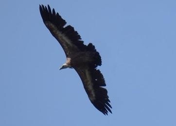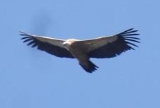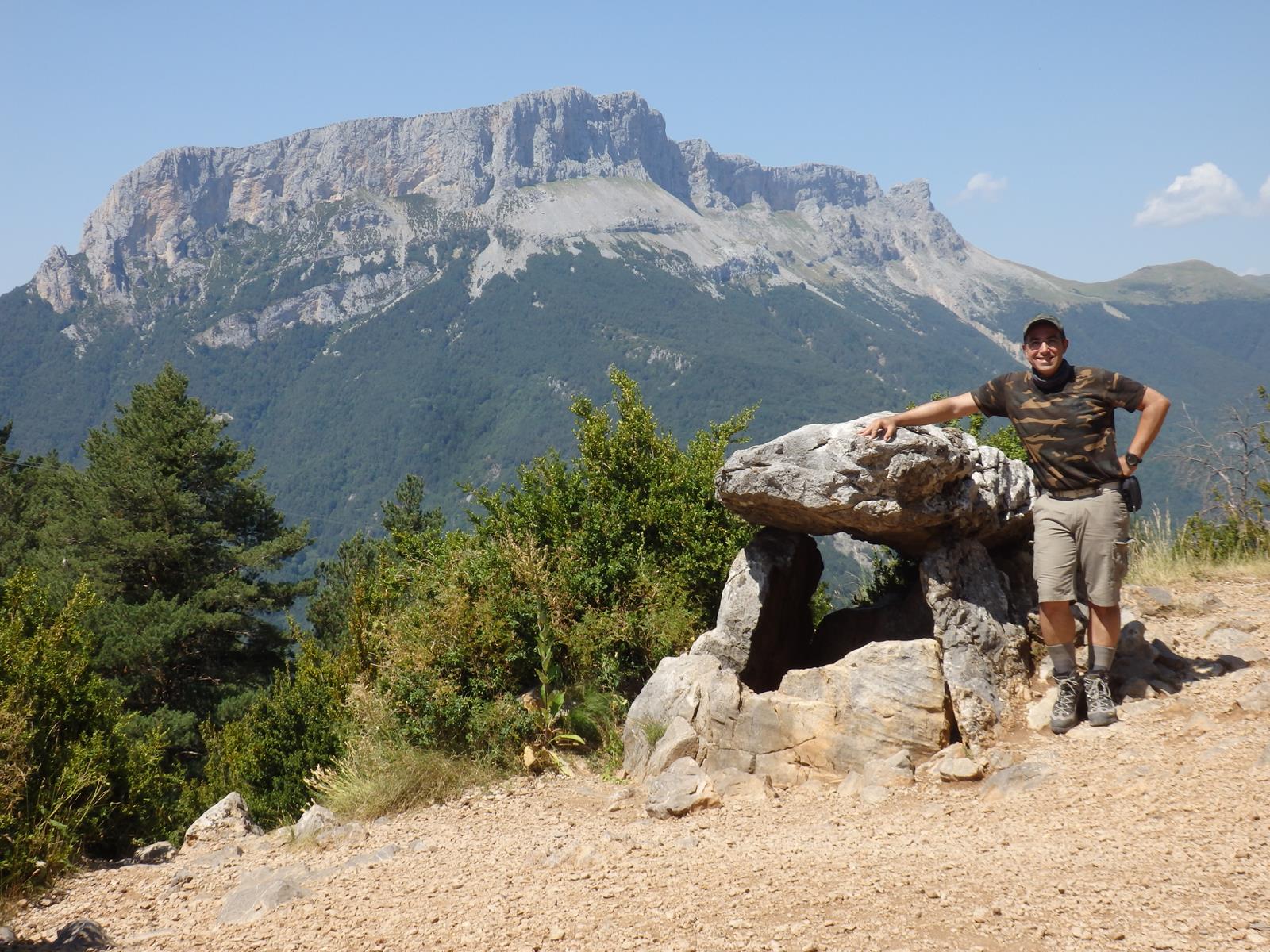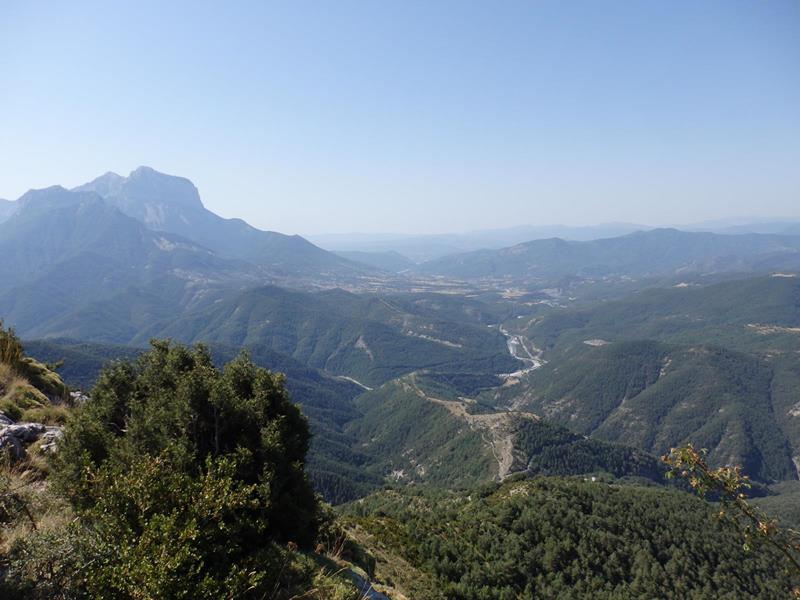 Una vez visto el edificio continúo dando un paseo por el entorno. Estoy en un punto en el que tengo unas magníficas vistas de los picos y del valle que está debajo. Hay un panel indicativo con los nombres de todos los picos que pueden verse. Es majestuoso. Unos cuantos buitres me sobrevuelan. Son bastantes. Estoy yo también a vista de pájaro. Se pueden observar en la lejanía el Castillo Mayor (2.014 m), el Soum de Ramond o Pico Añisclo (3.259 m) se ve Punta las Olas (3.032 m), Las Tres Marías (La Suca de 2.807m, La María Occidental de 2.780m, y la María Central de 2.753m) La Zuca (2.617 m),Sierra Custodia, la Garganta de Escuaín, el límite del Parque Nacional de Ordesa y Monte Perdido…en fin, una maravilla.