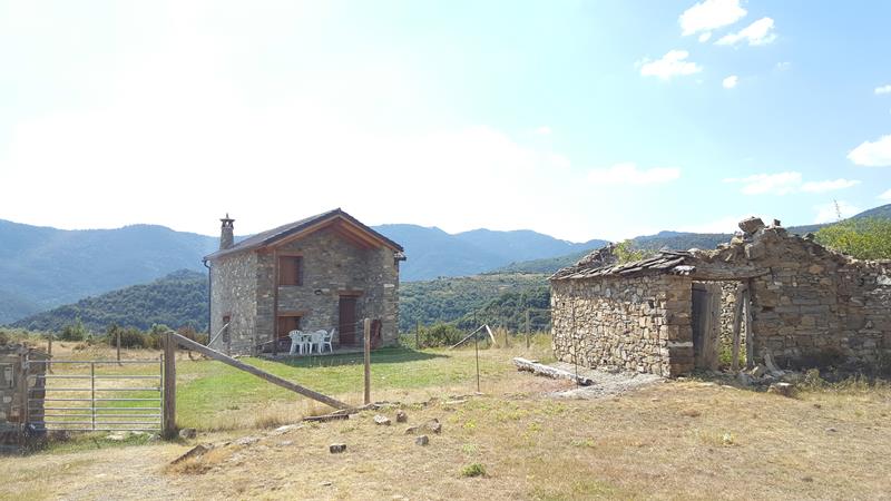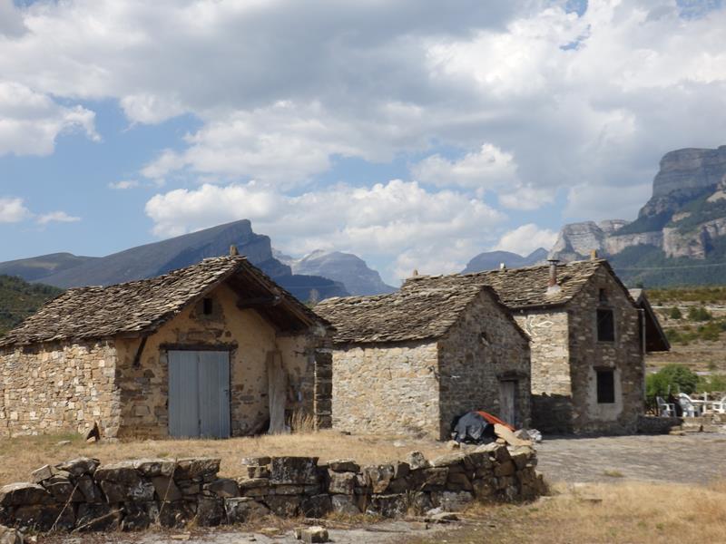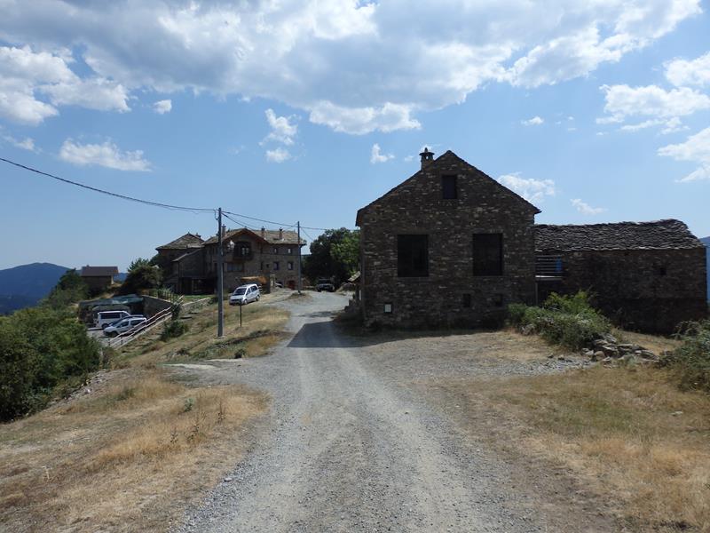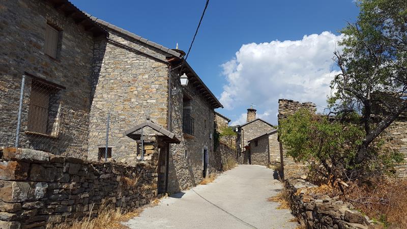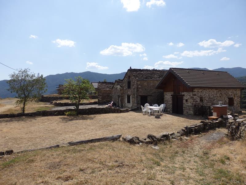 Al poco me cruzo con un hombre de mediana edad y le pregunto lo mismo, que si hay algo más para ver que merezca la pena, por si sigo avanzando o me doy media vuelta. Me comenta que hay en la parte baja unas bordas reformadas, que me acerque. Para allí voy. Desciendo por una calle hasta lo que parece el final del pueblo. Las calles ya no están empedradas, paso a una zona de tierra. Sobre una loma veo a la derecha varias bordas (casas de piedra donde antiguamente se guardaba el grano y el ganado, y que mucha gente las ha reconvertido en viviendas). Todas tienen un espacio amplio en la parte delantera, algunas tienen barbacoas, mesas y sillas. Dentro de su simpleza resultan acogedoras.