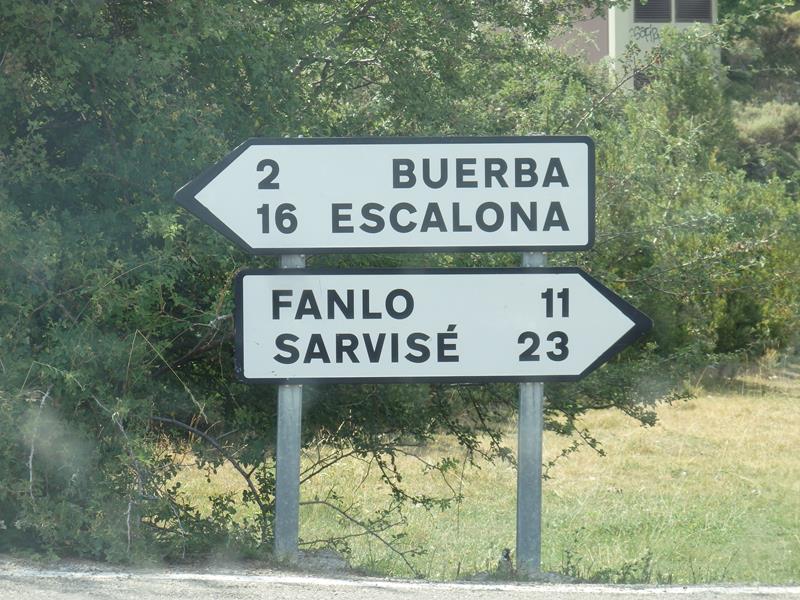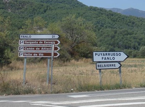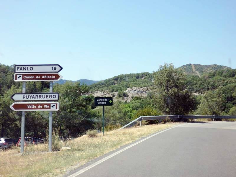Una vez en la entrada del pueblo de Escalona, y en una rotonda, a la derecha hay una indicación que dice Cañón de Añisclo y Valle de Vió, todo recto, y una indicación para ir a la Garganta de Escuaín, hacia la derecha. Nosotros tomaremos dirección Añisclo siempre. Tras una curva se puede entrar si quieres en el pueblo de Puyarruego, pero se deja a un lado y se sigue avanzando dirección Fanlo y Cañón de Añisclo. Hago fotos de las direcciones a tomar siempre que puedo, pero evidentemente, no en marcha, sólo cuando estoy parado y si la situación me lo permite.