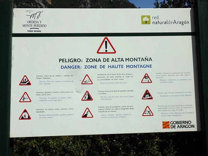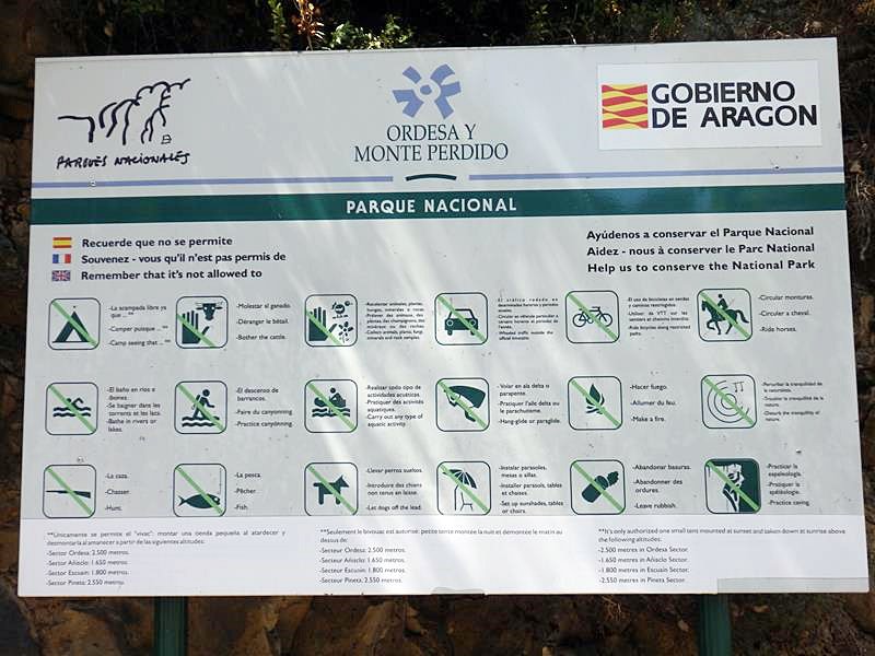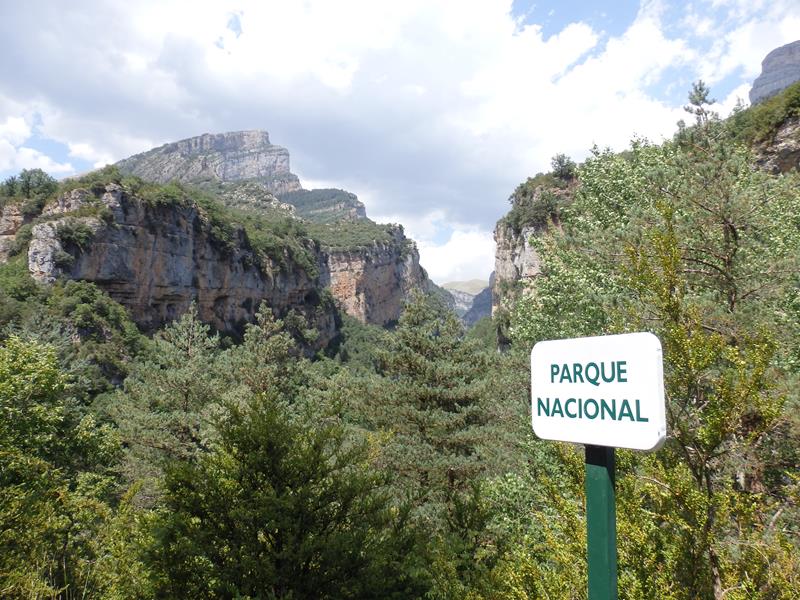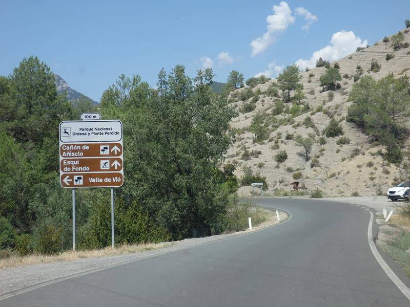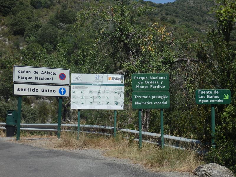 Al cabo de un rato, te encuentras con un montón de señales, (el que no las vea es que está ciego), donde te indica que entras en el Parque Nacional de Ordesa y Monte Perdido y lo más importante, que la carretera se convierte vía de sentido único, es decir, que habrá que volver por otro lado, como ya explicaré. Esto lo hacen las autoridades en época estival porque hay muchos más visitantes y como más tarde comprobaré, que pasen dos coches a la vez por un mismo tramo y cada uno en sentido contrario, es prácticamente imposible por la estrechez y las curvas que presenta esta carretera de alta montaña. Pero por otro lado, que sea de sentido único es una gran ventaja. Puedes disfrutar del recorrido como yo hice y pararte tranquilamente a disfrutar del paisaje cuando hay arcenes disponibles, porque merece mucho la pena.