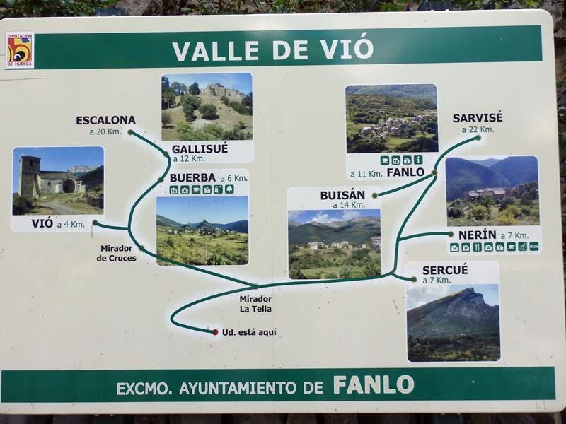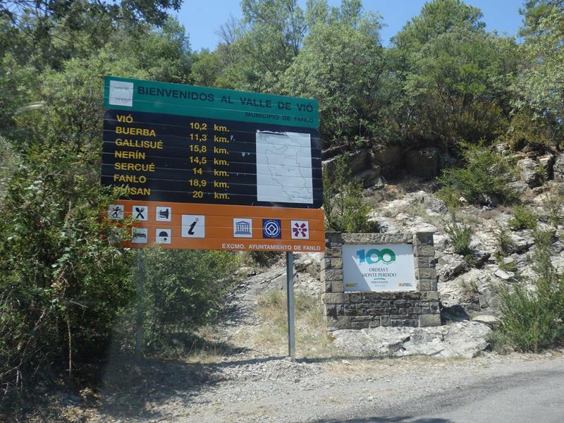 La carretera sigue y un espacio a mano derecha me permite pararme y aparcar para contemplar el paisaje tranquilamente. Curiosamente, un panel grande, similar al que ví en la carretera de subida está colocado en el margen de la carretera con las distancias a los pueblos del Valle de Vió. El que está más arriba en la lista es el más cercano. El que está más abajo, el más alejado. Cambia el orden de los pueblos y las distancias respecto al otro cartel que vi por la mañana, pero sigue el mismo patrón.