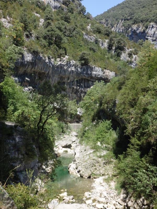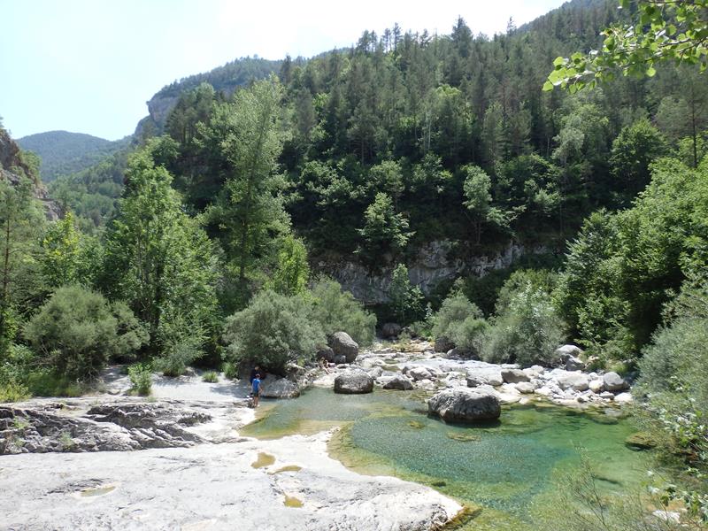 En un momento determinado la carretera cruza por un puente el río Bellós y como no viene nadie, (en realidad solo me pasaron algunos coches cuando estaba viendo las estalagmitas), paro en un lateral una vez pasado el puente y aprovecho para hacer unas cuantas fotos desde él al cauce del río y a las pozas de agua verdosa y cristalina que forma.