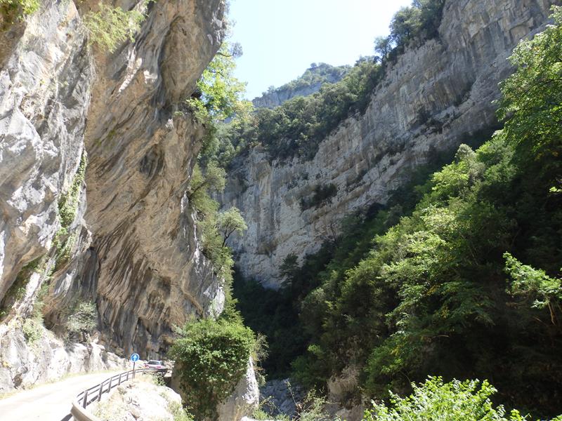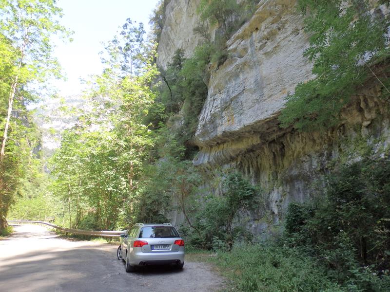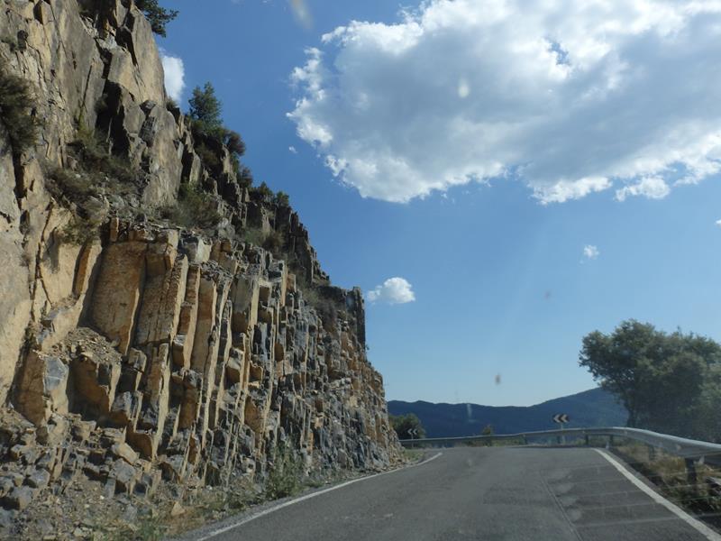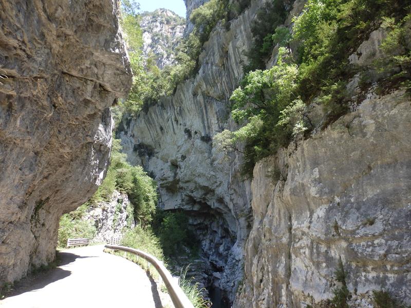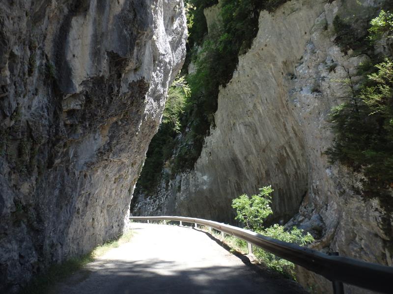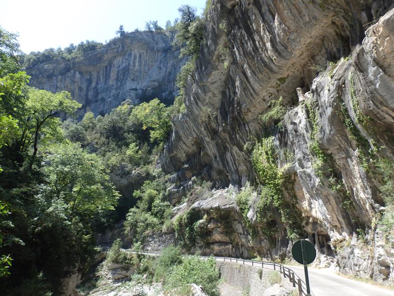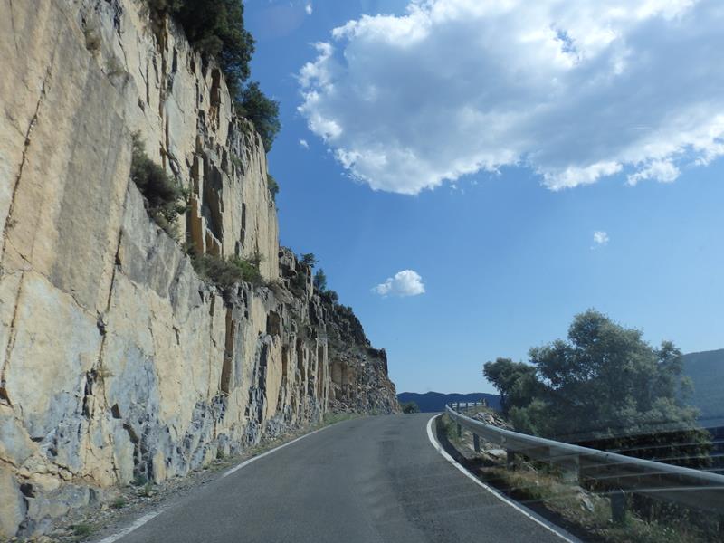 Continúo. La carretera cada vez se mete más y más en el cañón. Se puede ver como las paredes van ganando cada vez más altura y como dejan ver las grandes cicatrices y marcas que a lo largo de miles de años ha ido haciendo el agua del río.