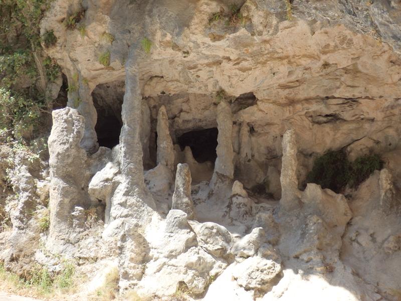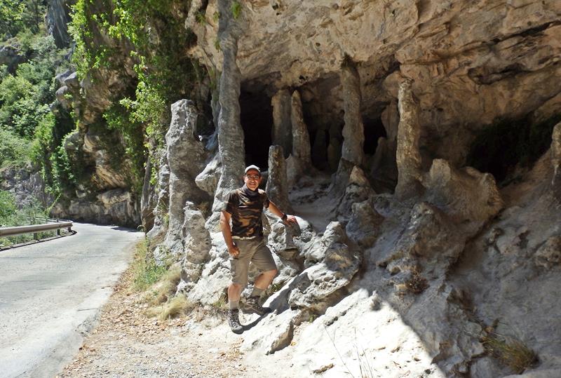 En un lateral veo una especie de cueva en la roca, en la que se han formado estalagmitas. Paro a verlas. Es curioso lo que hace el agua cuando disuelve poco a poco la roca. El agua carbonatada cayendo del techo gota a gota durante muchísimos años ha conseguido incluso convertir las estalagmitas en columnas al terminar de unirse con el propio techo.