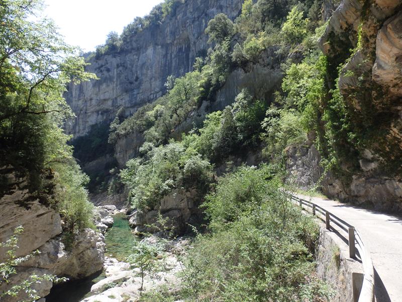 Al poco rato la carretera se interna en el Cañón. Y aquí viene lo bueno. Paredes de roca desgastadas por el cauce me rodean, y más abajo, el río. El paisaje es absolutamente espectacular. Este paraje se conoce como el Desfiladero de las Cambras. Disfruto muchísimo contemplando todo esto. Me encanta la carretera, porque me gusta conducir y por estas rutas que no se han modernizado aún más.