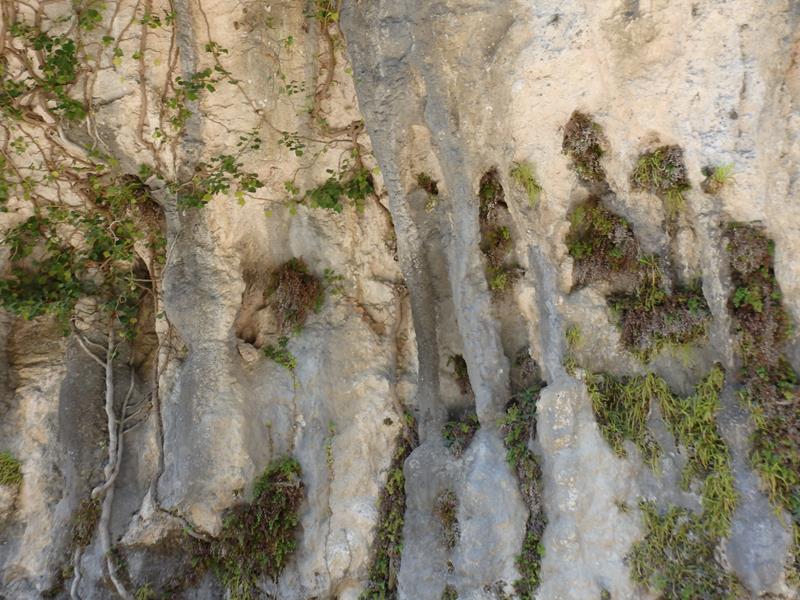 En algunas paredes veo las plantas llamadas “atrapamoscas”, un montón de ellas. Es la Pinguicula. Vive sobre las rocas calizas que rezuman agua. Sus hojas son verde amarillentas y tienen un sustancia pegajosa. Con ella atrapan pequeños insectos, moscas y mosquitos que luego digiere. Mejor no ser insecto por aquí.
