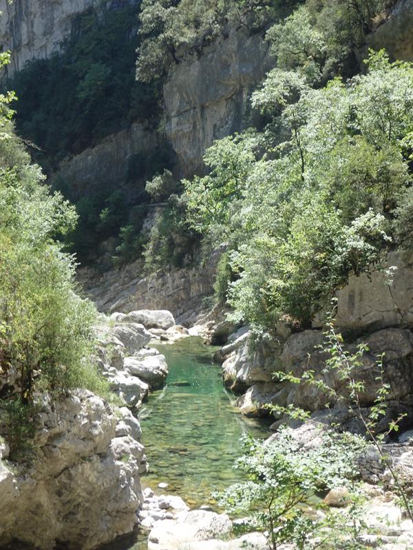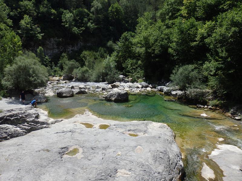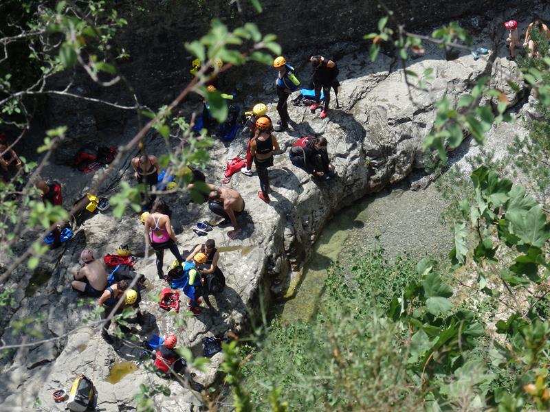 El camino continúa pegado a la pared del cañón pero ladera abajo se oyen voces. Muchas. La vegetación no me permite ver, pero tengo curiosidad y cuando el sendero permite observar el cauce del río descubro un montón de gente que está abajo, sobre unas piedras justo en el margen del río, que llevan puestos trajes de neopreno y cascos.