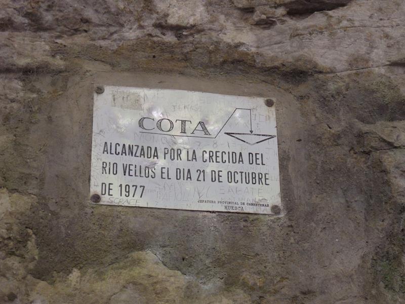 En un lateral, en la roca que da a la carretera, hay una placa. ¿Qué será? Me acerco. Dice: “ Cota alcanzada por la crecida del río Vellós ( o Bellós) el día 21 de octubre de 1.977” impresiona ver el lugar en que está colocada la placa porque supera ampliamente el nivel de la carretera. Y hay que contar con el trozo que queda hacia abajo, unos cuantos metros más hasta el lecho del río. La palabra que usaría para definir lo que veo es «espectacular». Ya me lo habían dicho, pero se quedaron cortos.