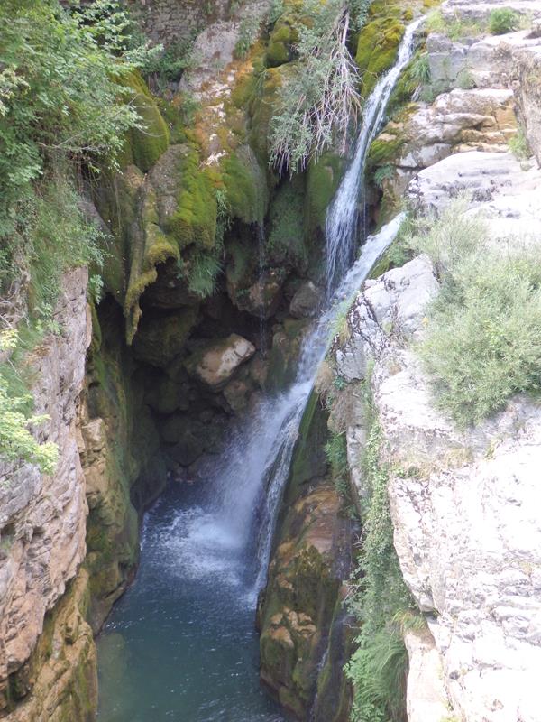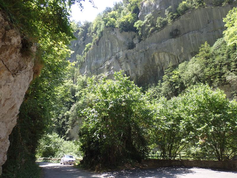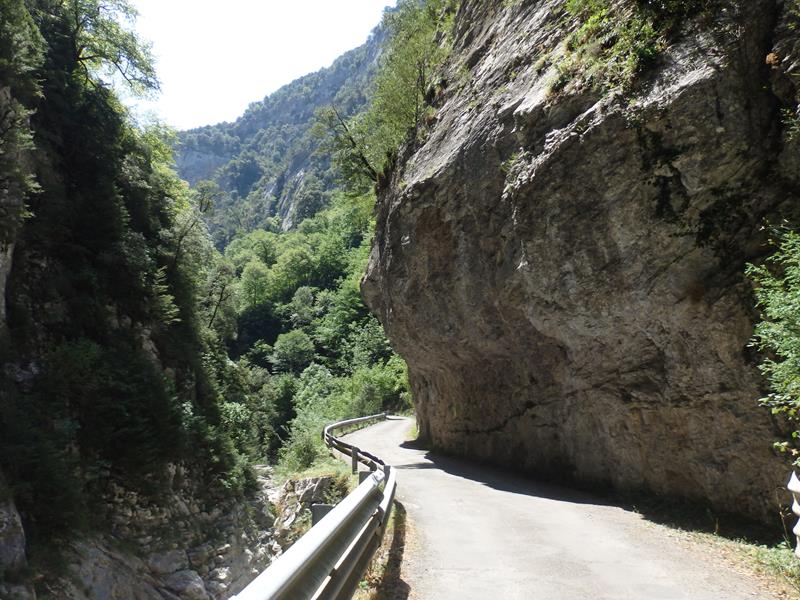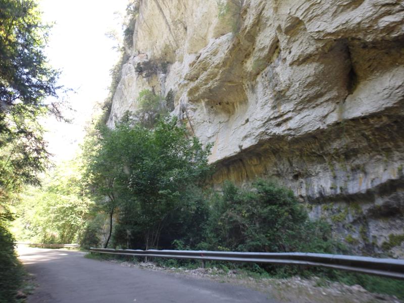 Salgo de Buerba y me voy a Escalona, no sin antes haber recargado la botella de agua fresca en la fuente. La carretera sigue siendo muy sinuosa, con muchas curvas y estrecha, casi siempre en descenso. No hay tráfico. Voy solo. A mi izquierda las paredes de roca como cortadas a cuchillo. Algunas con curiosas formas geométricas. A mi derecha, el precipicio, bien protegido por el correspondiente quitamiedos.