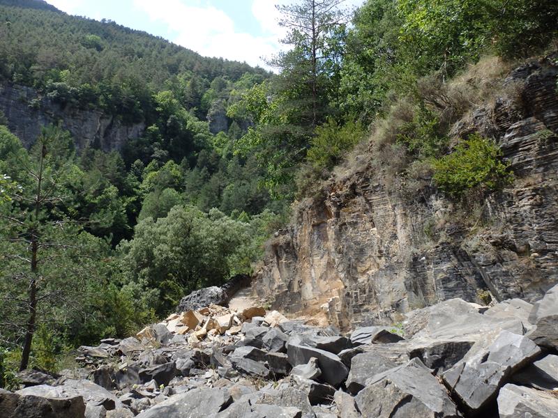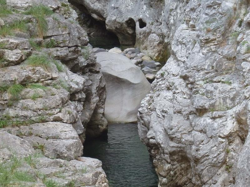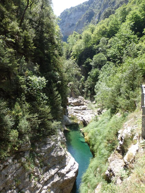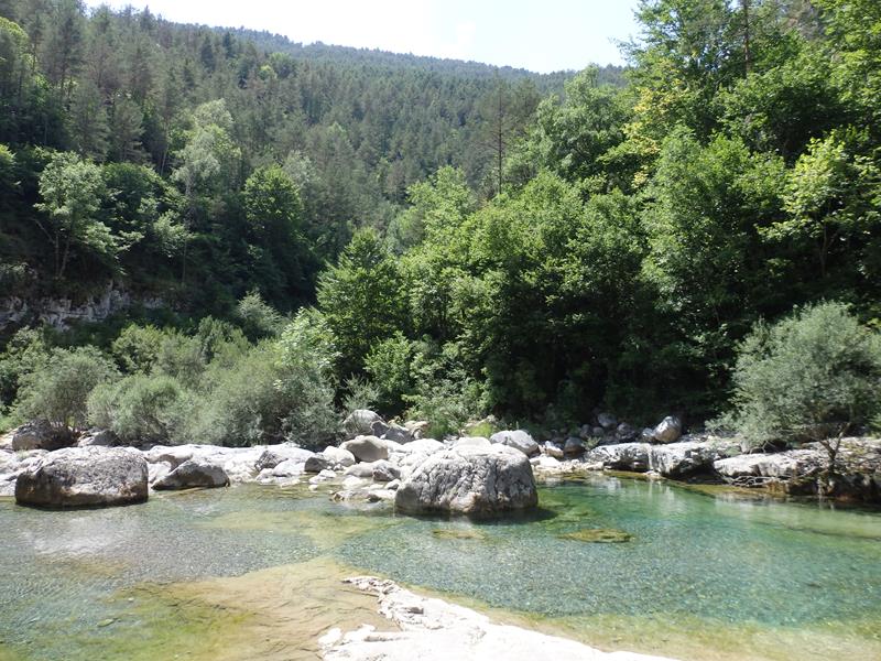 Vuelvo a parar. Desde la carretera, apoyado en el quitamiedos, miro hacia abajo y veo los grandes bloques de piedras que han sido arrastrados, a saber hace cuanto tiempo, y que se han quedado ahí, atascados como testigos de la potencia del agua que los arrastró. A su alrededor el agua cristalina, verdosa incluso, que discurre por el fondo del río Bellós.