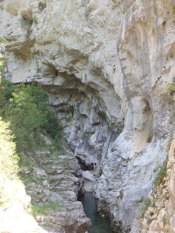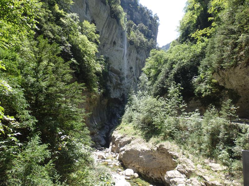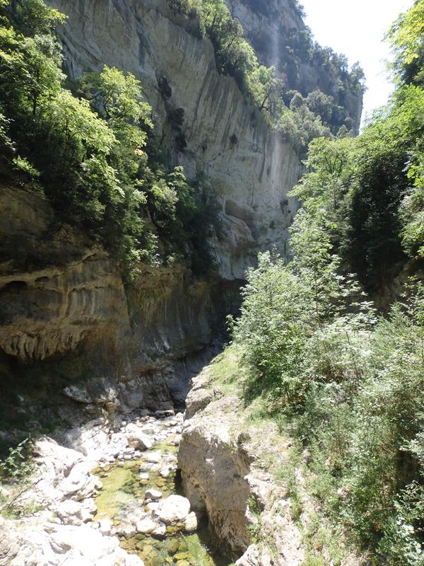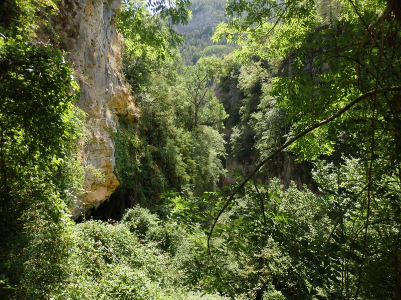 La vegetación es muy frondosa cerca del fondo, y más abierta y propias de climas más cálidos hacia la parte más alta. Esto no debería ser así. Y es que aquí se produce el fenómeno de la inversión térmica. En teoría, y en una situación normal, las plantas que necesitan más calor crecen a menor altitud. Normalmente, a medida que se asciende una ladera la plantas de climas más fríos crecen a mayor altura. Aquí con la inversión térmica, y al ser el cañón profundo y sombrío, el aire frío queda atrapado en el fondo, taponado por una capa de aire caliente. El aire frío pesa más, y no se puede elevar, pues no le deja subir el caliente que lo tapona. Por eso la temperatura es más fría en el fondo y más cálida a medida que se asciende por las paredes del cañón. Conclusión, el mundo al revés. Hayas, tilos, abedules y sauces están abajo y las carrascas y encinas que son plantas de clima más seco están arriba.