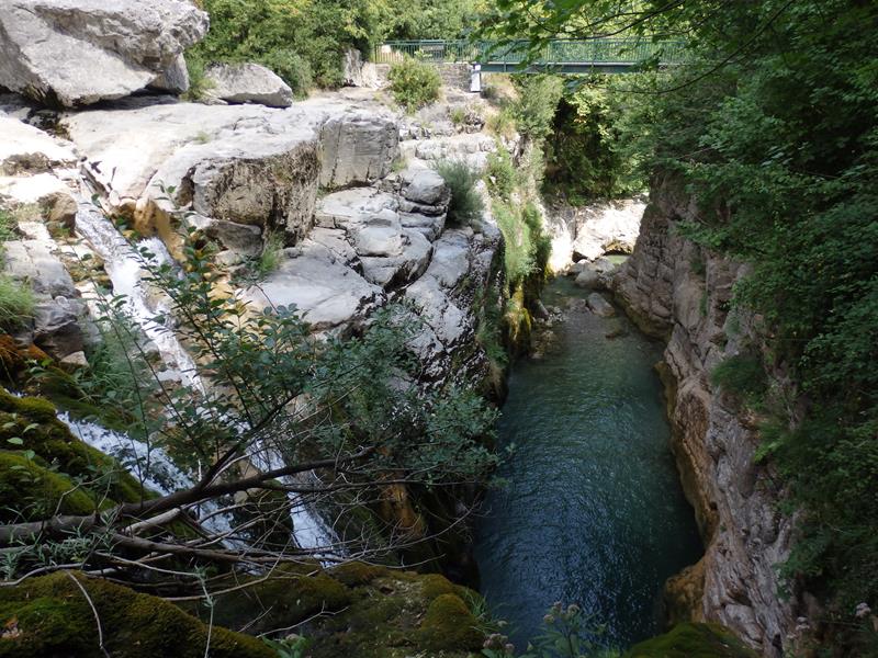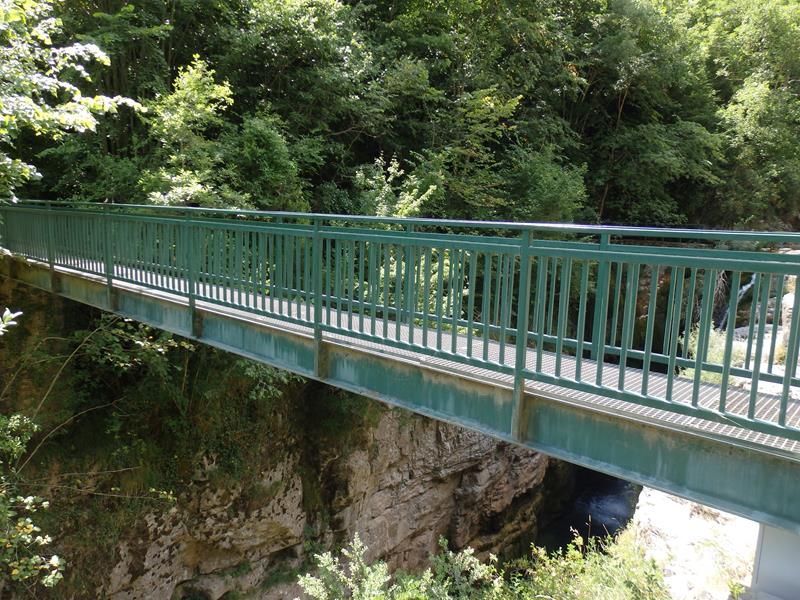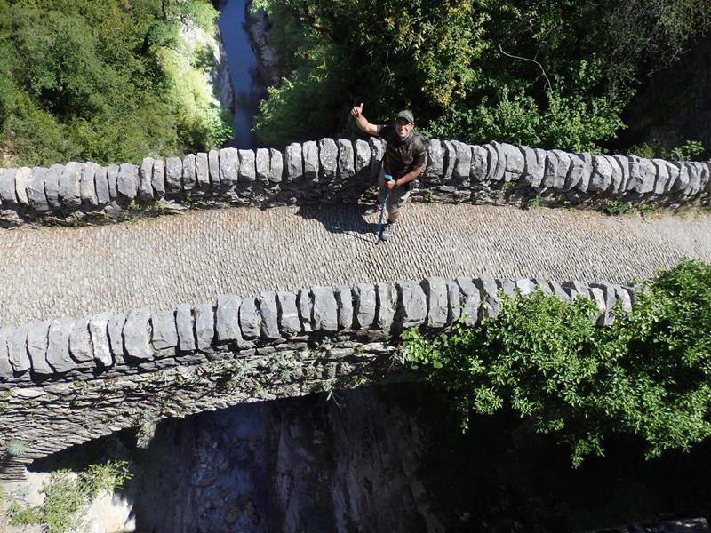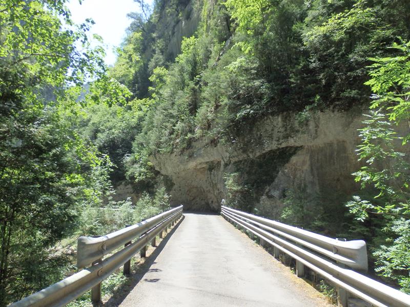 Cuando estoy cruzando el puente «nuevo» me doy cuenta de que si pidiera a alguien el favor de que me hiciera una foto cruzando el puente «viejo» quedaría muy chula la instantánea. Y es posible, pues el antiguo puente de piedra está en una cota más baja. Así que veo a una excursionista que está esperando a unos amigos que vienen a lo lejos y que aún tardarán algo en llegar. Está apoyada en la barandilla. Aprovecho la circunstancia y le pido que me haga alguna foto. Se presta a ello rápidamente, es una persona muy agradable, todo hay que decirlo, así que voy corriendo al otro puente para no hacerle perder mucho tiempo y una vez allí me hace unas cuantas fotos. El puente está colgado sobre el vacío del cañón, pero en las fotos no se aprecia tanto como en la realidad, no le hace del todo justicia, pero bueno, al menos queda para el recuerdo.