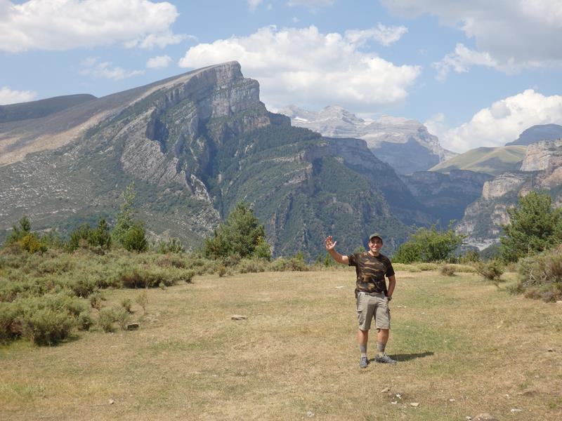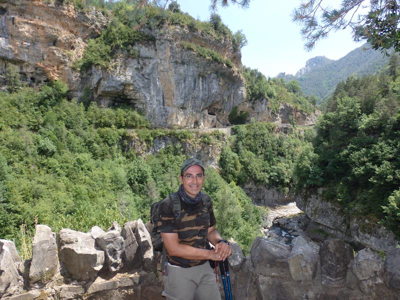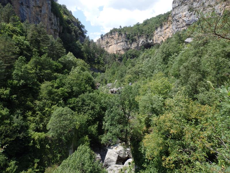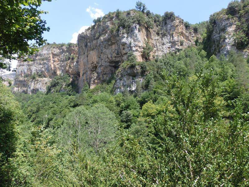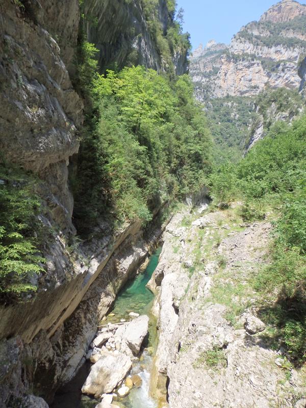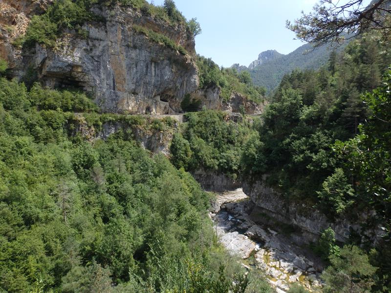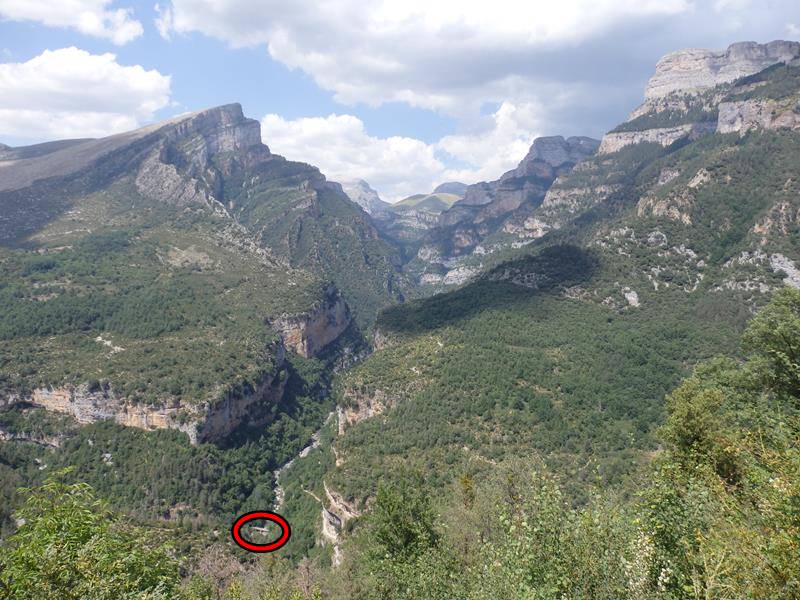 En el horizonte, al fondo, se aprecia el Collado de Añisclo (2.453 m) y claramente también los tres picos que sobresalen, todos tresmiles, Monte Perdido (3.355m),Pico Añisclo o Soum de Ramond (3.263 m) , y Punta de las Olas (3.002 m). A la derecha se ven los Sestrales, (el alto 2.101m y el bajo 2.074 m) , y al fondo a la derecha las Tres Marías (La Suca de 2.807m, La María Occidental de 2.780m, y la María Central de 2.753m). La visión es impresionante. En este momento me doy cuenta de que ni siquiera he pisado la punta del iceberg, pues toda la profundidad del Cañón de Añisclo me espera para próximas excursiones, sólo he picoteado el principio y me ha parecido imponente. No quiero ni pensar lo impactante que será ir más allá.