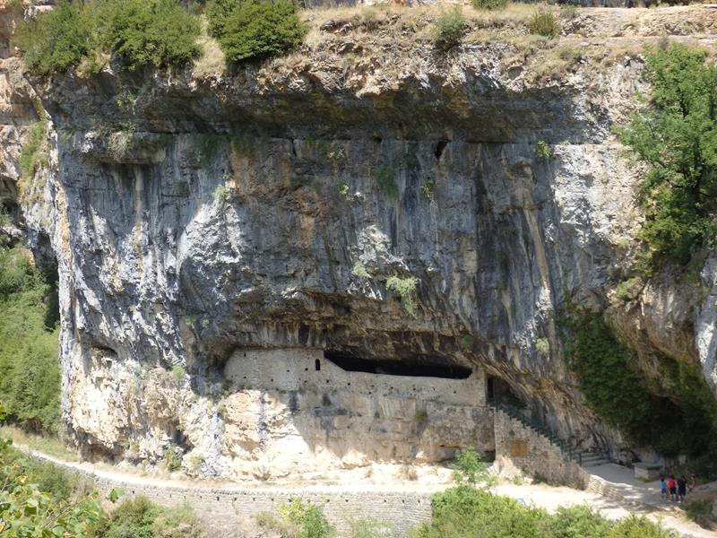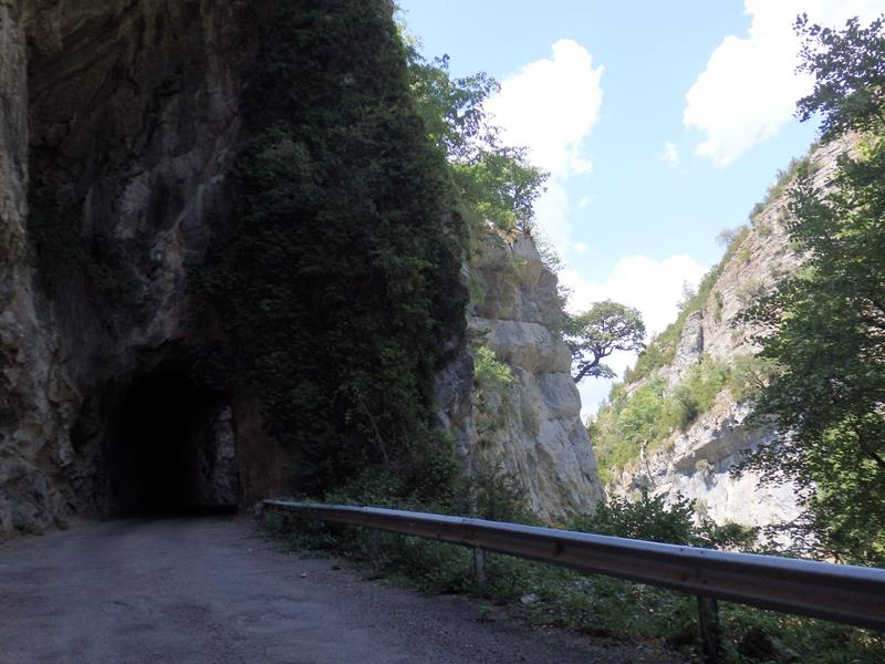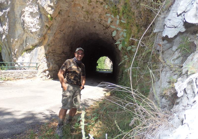 Justo al lado de esta zona abierta, se continúa por un túnel que atraviesa la roca. Me hago una foto sujetando mi pequeño trípode a una piedra que sobresale. No será el único túnel. Hay alguno más. Son sombríos y frescos. Las paredes dejan ver la roca viva, que da la impresión, tuvo que ser excavada a base de pico y pala. Algunos túneles dejan pasar algunas gotas de agua, que caen del techo, seguro que de filtraciones de la propia montaña.