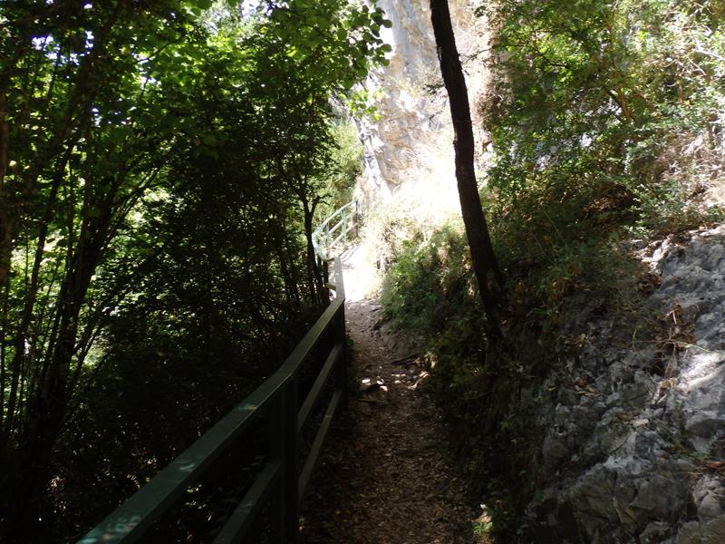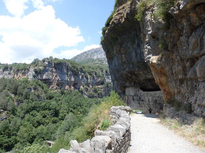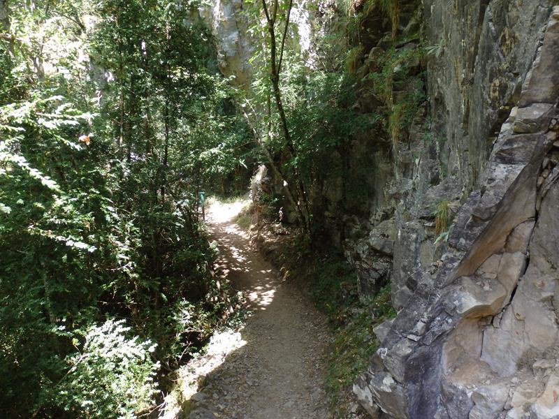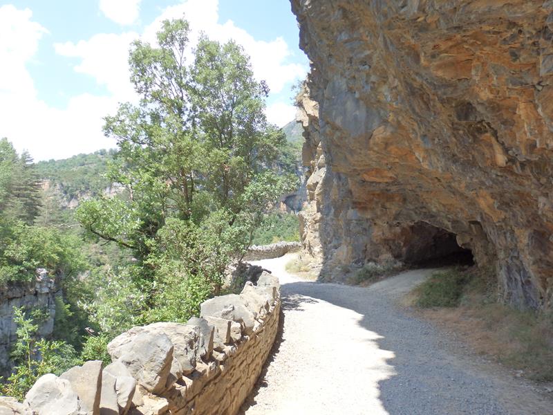Ya en el otro lado, entras en una pista de tierra, bastante ancha, por la que hay que continuar y que va pegada a la pared de roca. Hay paneles y carteles referentes a la zona nada más cruzar. Tiene un murete de piedra bien acabado a su izquierda, de forma que te protege del cortado.