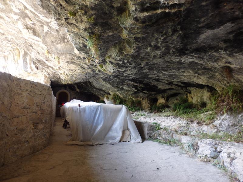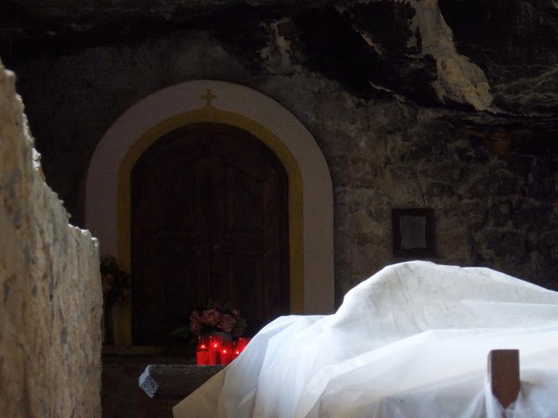 Me acerco a verla. Hay unas escaleras que te llevan a una puerta que está en alto. Llego hasta ella pero está cerrada. Mirando hacia dentro veo como un pequeño altar al fondo con unas velas y un poco antes, tapado con una especie plástico blanco hay como unas cajas. Tras las velas se ve una puerta. Quizás parte de la superficie de la ermita esté dentro de la roca. De todas formas todo tiene un aire de provisionalidad, como si estuvieran haciendo reformas.