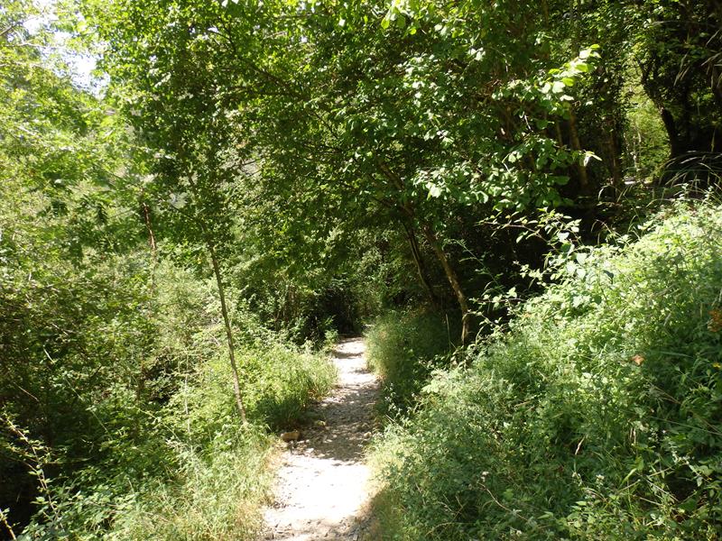 Tras un rato en continuo descenso, se llega a un puente de madera que cruza el río, pero yo decido bajar primero hacia un remanso y unas pozas que hay a ambos lados. Hay gente remojando los pies nada más. Al menos no se están bañando. O al menos yo no veo que lo hagan. Me acuerdo del cartel. Igual hacen caso. Aprovecho el agua fresca del río para mojar mi pañuelo de cuello que me protege del sol y también refrescarme la cabeza. Estos pañuelos, una vez húmedos, son un alivio para el calor una vez puestos tras mojarlos. Tampoco el calor es especialmente agobiante, pero viene bien.