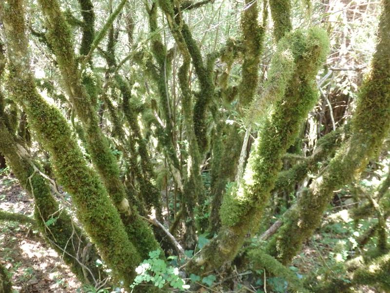 La senda abandona la pista principal y va hacia la izquierda, descendiendo por un camino frondoso y fresco, lleno de vegetación. Será por la inversión térmica que comenté antes que hay tanta variedad de plantas. Veo hasta un liquen muy vistoso poblando ramas y troncos de muchos árboles jóvenes.