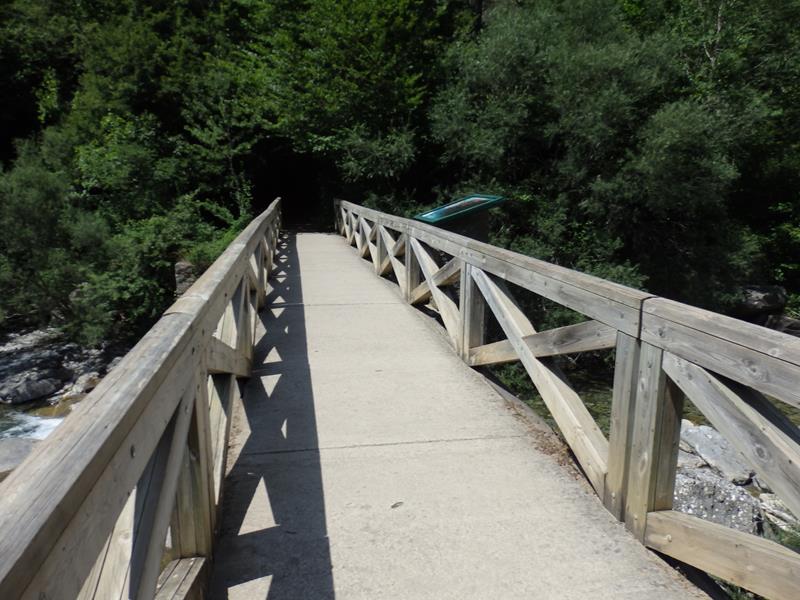 Una familia de vascos, lo sé por como hablan, pasan también por el puente, salvo uno de ellos, un hombre que parece quedarse rezagado. Les pido una foto porque yo no puedo apoyar mi pequeño trípode en ningún lado como he dicho. Me la hacen muy amablemente. Luego me ofrezco yo, a hacerles a ellos otra y a esperar a que el miembro que falta llegue. Pero la mujer me dice que su marido sufre de vértigo y que va muy apurado para cruzar, no se va a parar en el puente, por eso se había quedado esperando. Hasta él me dice a lo lejos, gracias, pero no puedo quedarme en el medio del puente quieto. Ella había pasado a los chicos primero y ahora volvía a por él. En fin, pienso que es un problema para disfrutar de la montaña en condiciones tener vértigo. Menos mal que yo no lo tengo.