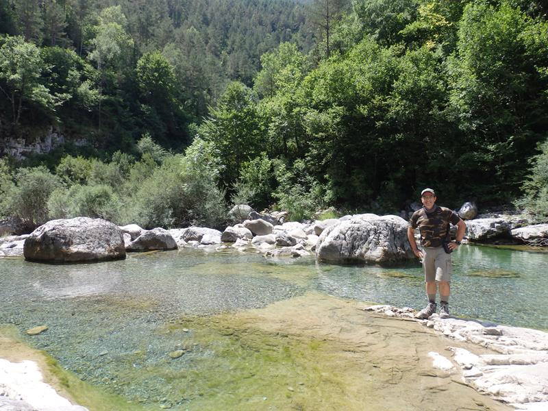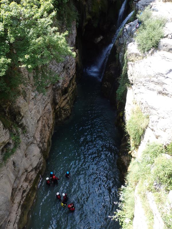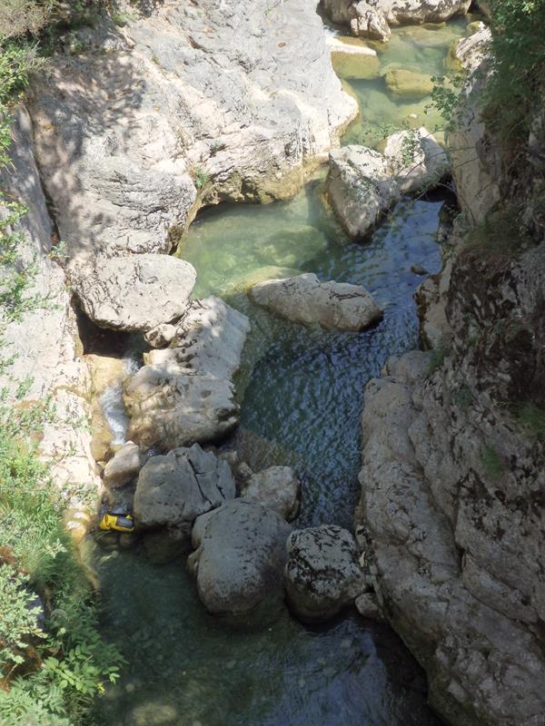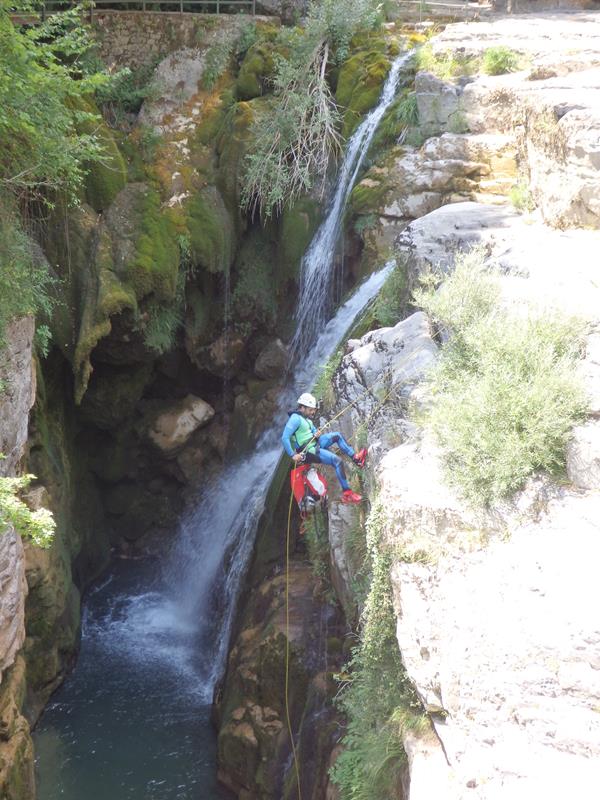 Mirando hacia abajo, a una altura nada despreciable, veo una zona del río que forma una gran poza entre paredes de roca. Por una de éstas desciende un barranquista haciendo rappel. Se ha enganchado a la pared y cuando aún le queda parte del recorrido, se deja caer en el agua de la poza como el que se tira a una piscina donde le esperan sus compañeros.