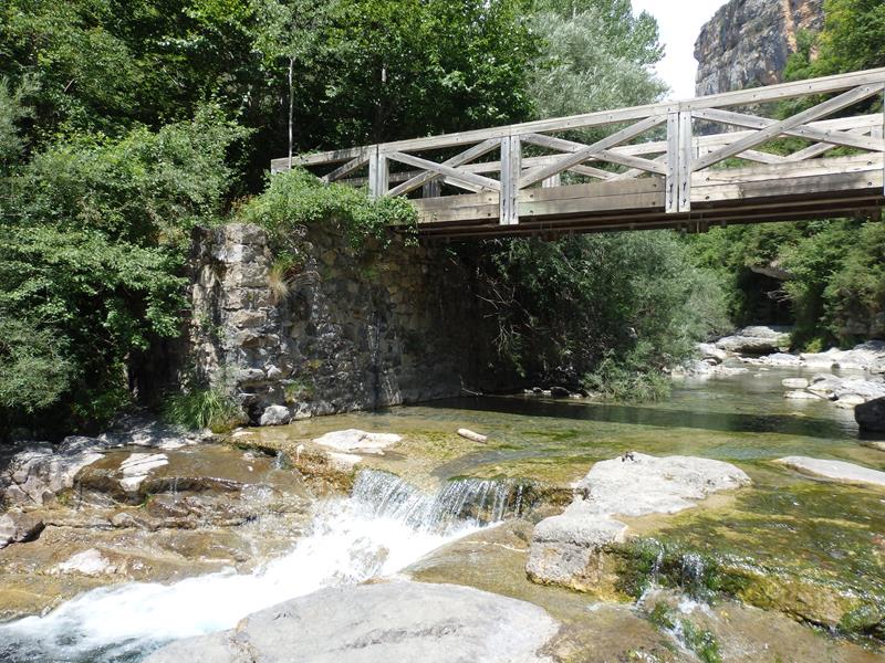 Ya pertrechado de todo lo necesario, voy a comenzar la marcha. Pero llegar hasta aquí en coche me ha sorprendido tanto que podría haber sido otra excursión en sí misma. Me ha gustado un montón. He hecho un montón de fotos. Pues bien, me pongo a caminar. Al poco rato llego a una zona llena de carteles indicativos de las distintas rutas que se pueden seguir y un puente, bueno para ser exactos, dos. Las señales indican la dirección que podemos tomar si queremos acceder a varios lugares dentro del Cañón de Añisclo.