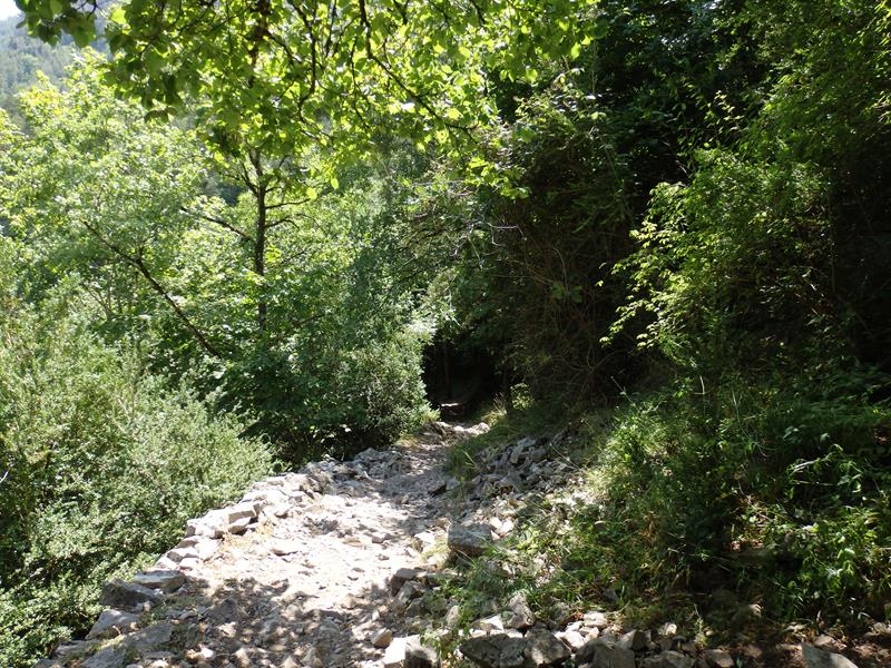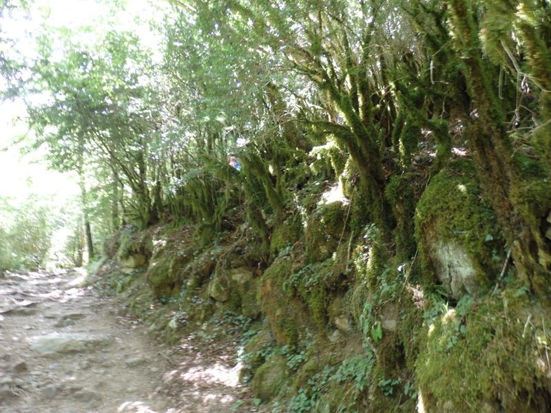 Otra vez sigo subiendo por una senda sombría y rodeada de árboles y musgo y al final el camino se convierte en una pista más o menos ancha, pero agradable, que va paulatinamente también ganando altura. Hay que subir todo lo que antes descendí por el otro margen.