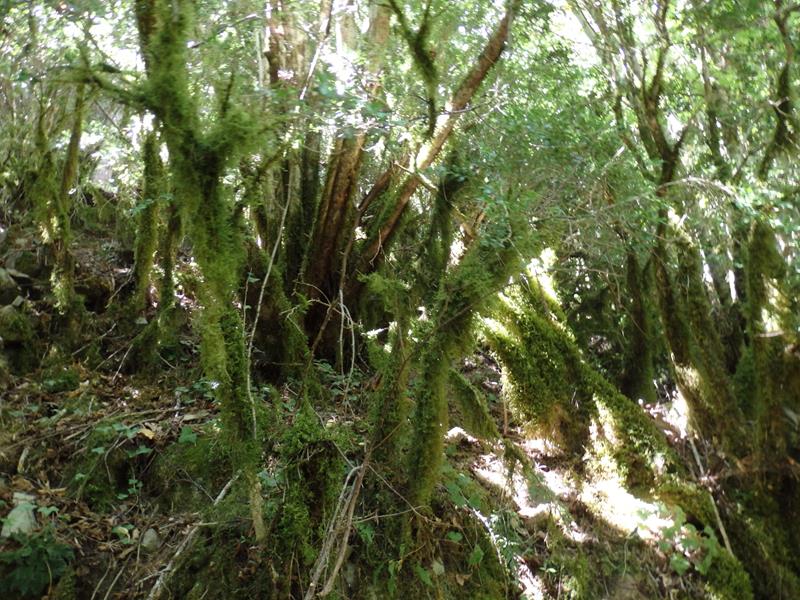 Vuelvo a internarme en el bosque, esta vez el sendero sube de forma bastante pronunciada entre la vegetación. Vuelvo a ver los líquenes. Toda la zona está en sombra y es agradable.