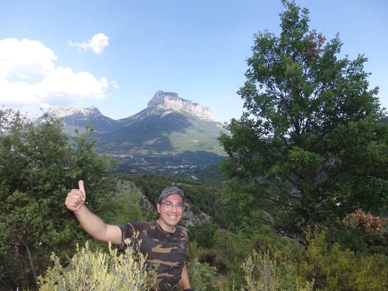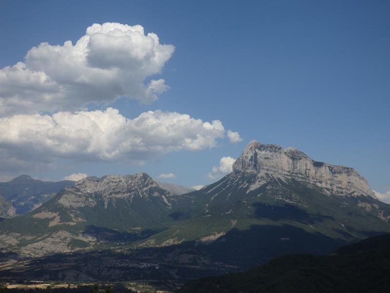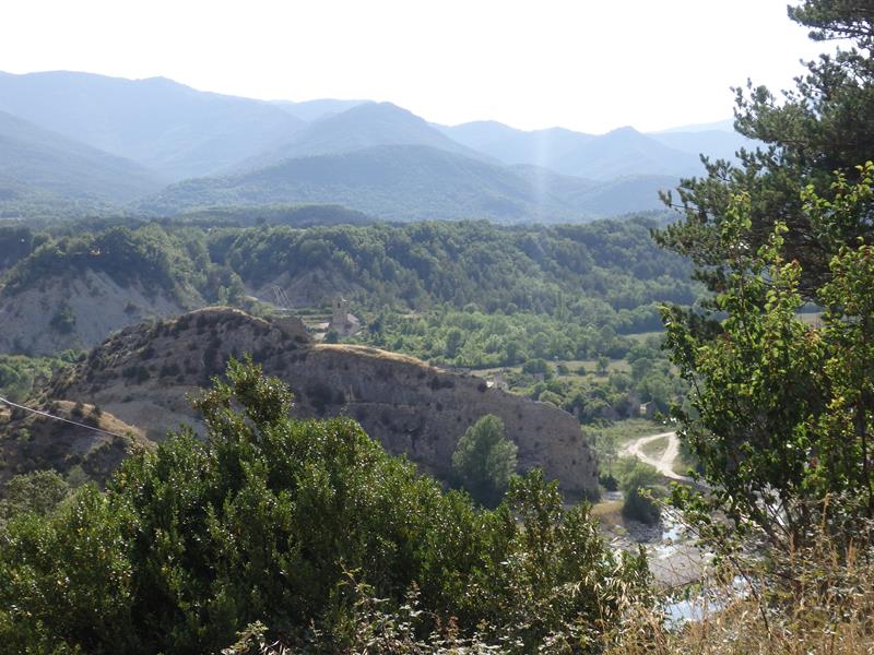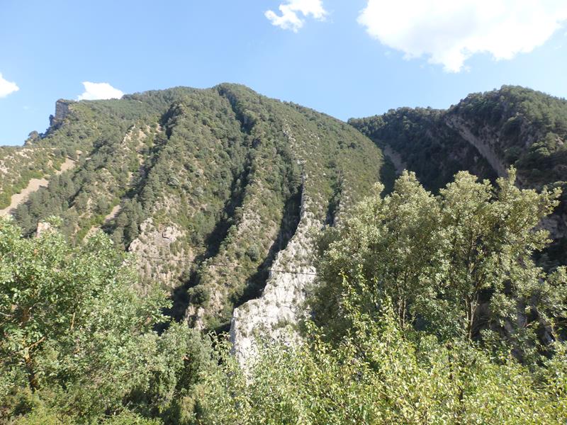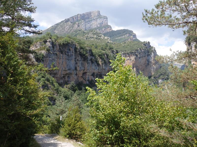 Al rato veo una pequeña explanada a modo de mirador donde hay un panel explicativo. Paro. Estoy solo. Subo una pequeña loma y llego al panel. Habla, como no, de la Peña Montañesa. La visión desde allí de esta montaña y de las que la rodean, es espléndida. Peña Montañesa tiene 2.295 m, y es la cota máxima de la Sierra Ferrera. Esta montaña se formó por cabalgamiento de las capas de la corteza terrestre que luego por la erosión de las mismas durante millones de años, quedaron en resalte. Todo tiene una explicación. Las grandes montañas – y las pequeñas- no aparecen de la nada.