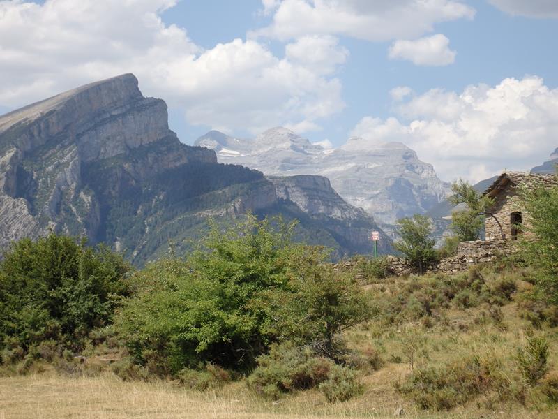 Nada más pasar el desvío, veo unos prados a mano izquierda donde hay una pequeña borda de piedra. Paro el coche. Aparco en un lateral. Pienso que desde esos prados se tiene que poder ver todo el Cañón de Añisclo, en una visión parecida a la del mirador pero yo diría que mejor aún,pues se ven perfectamente las tres serols.Me adentro en la zona y contemplo otra vez esa estupenda perspectiva de las montañas que tanto me gusta.