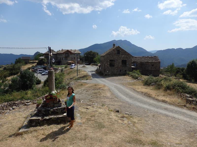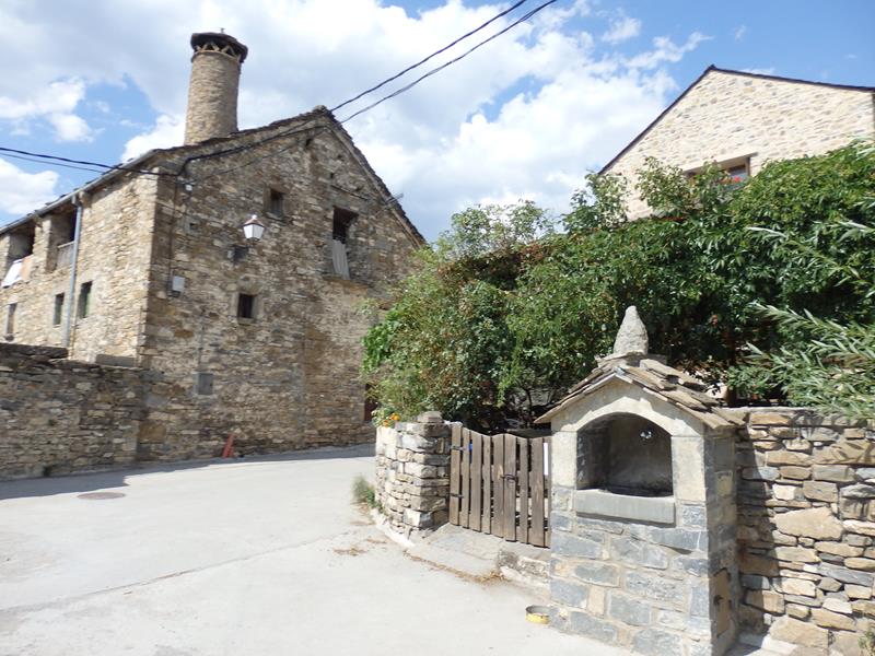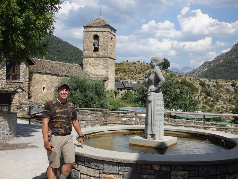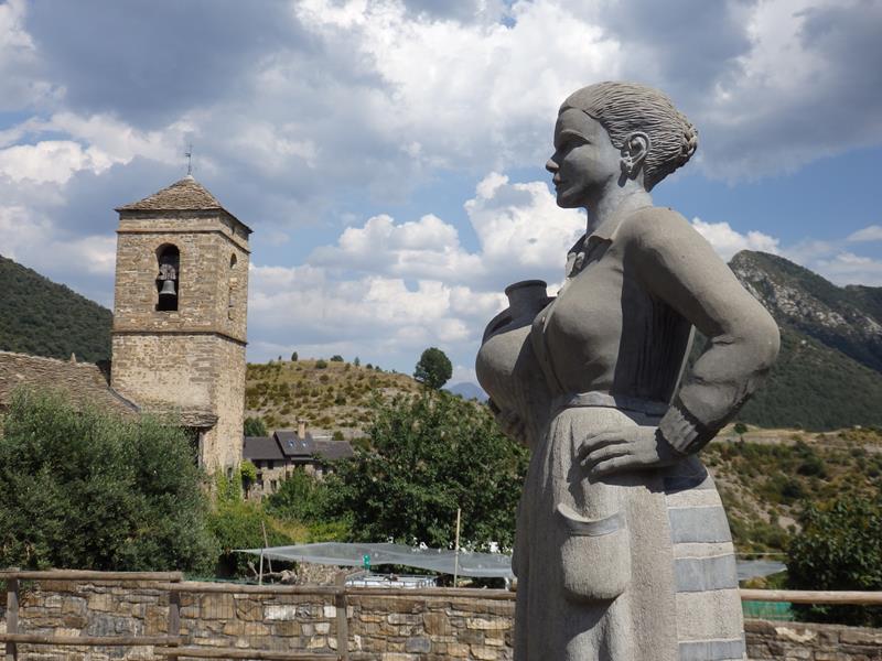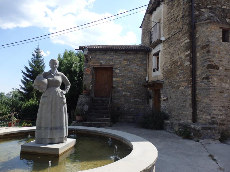 No me lo imaginaba así. Las calles limpias y cuidadas, hay detalles en las casas, jardines, flores…son todas de piedra, al estilo altoaragonés. Llego hasta una fuente circular donde hay una escultura de una mujer. Cerca está la iglesia.