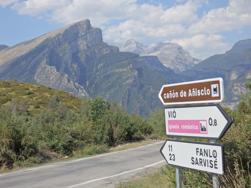 Una vez que ya he visto todo, me parece un lugar pintoresco, sin alterar demasiado, muy apartado del turismo masivo que a veces satura algunos pueblos del Pirineo. Nada que ver con eso. Vuelvo al coche. Salgo de Vió y llego al desvío que cogí al principio. Se ve el cañón de Añisclo y las señales que indican la dirección hacia ese lugar en un mismo plano fotográfico. Qué curioso. Hago la foto. Sigo. Aquí la carretera ya ha dejado de ser de un solo sentido.