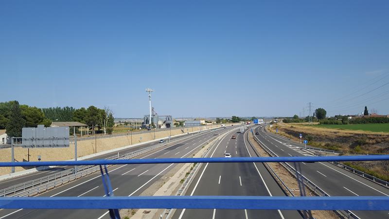 El sol ya se está poniendo en esta tarde de verano. El recorrido, por la misma carretera, en sentido contrario.Lo único diferente, el puente sobre el Gállego. Es uno más moderno junto al de hierro.