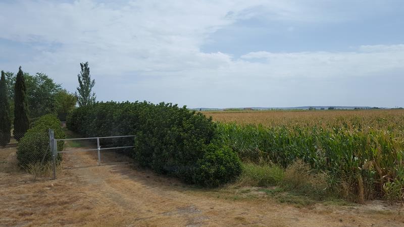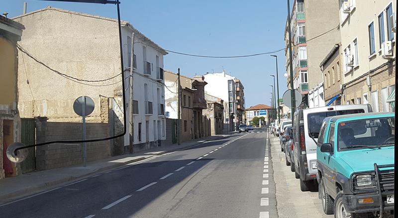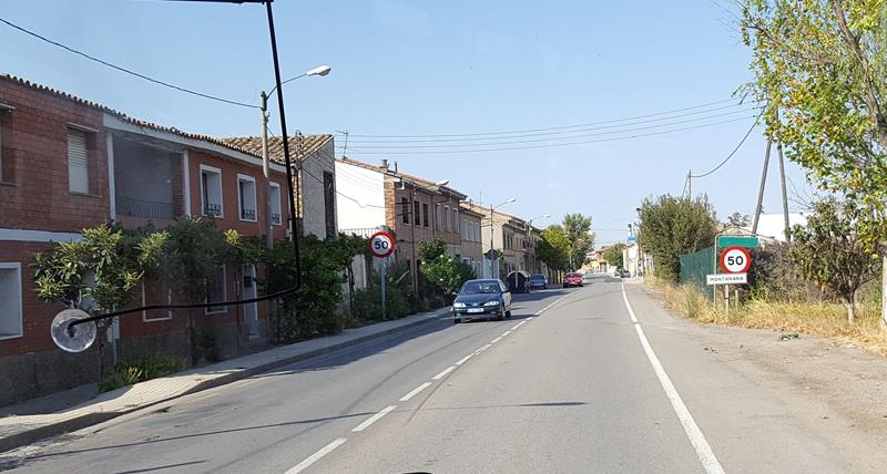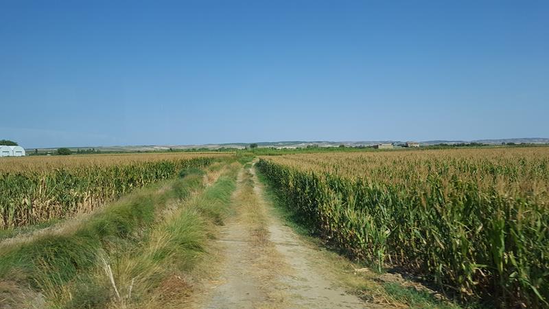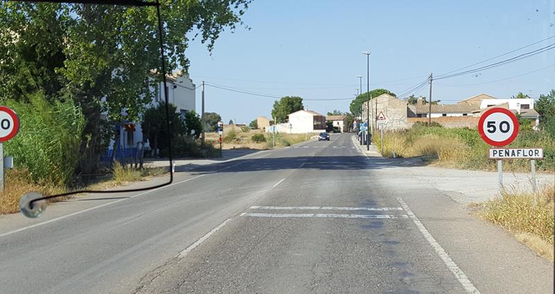 Ahora ya la visión es de horizontes abiertos y campos, muchos de ellos de maíz. A lo lejos veo la torre de una iglesia, tiene que ser la del barrio de Peñaflor. A las 17:18 horas el autobús entra en él y ya se ven las primeras casas.