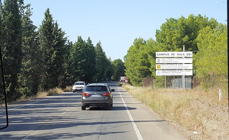 Pasamos al lado de la fábrica de electrodomésticos BALAY, que queda a la izquierda, para siguiendo recto, circular por encima del puente sobre la autopista AP-2 y continuar hacia Montañana y Peñaflor. Antes de llegar a Peñaflor se ve la Cartuja del Aula Dei a un lado de la carretera, a la izquierda.