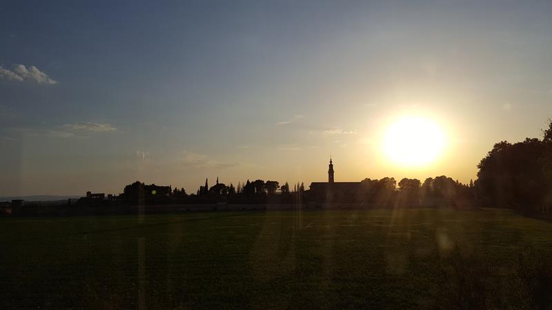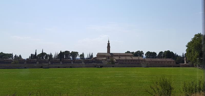 Mientras regreso, ya montado en el autobús, ha salido el sol. Puedo ver la Cartuja del Aula Dei perfectamente, con un campo inmaculadamente verde delante del emblemático edificio.