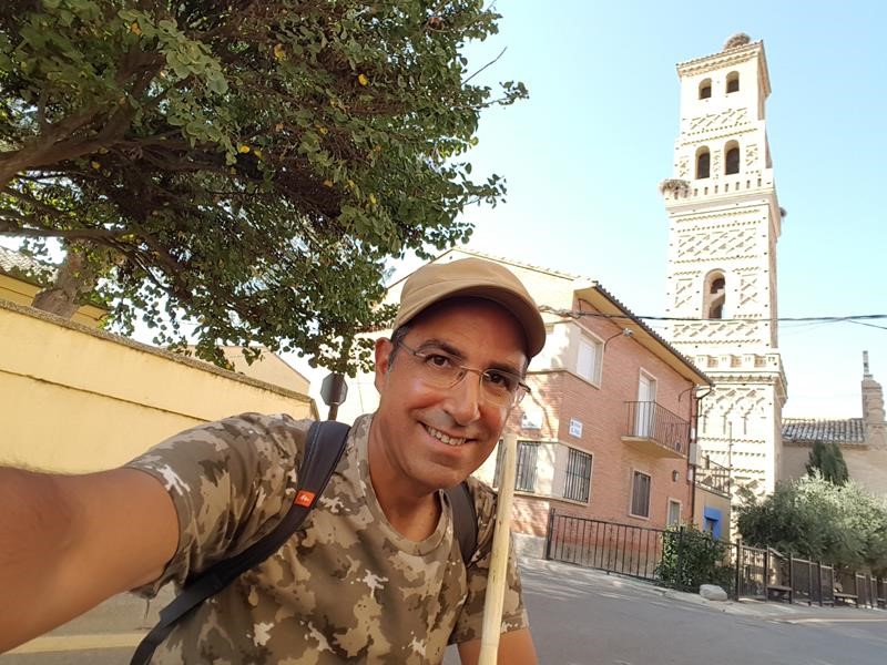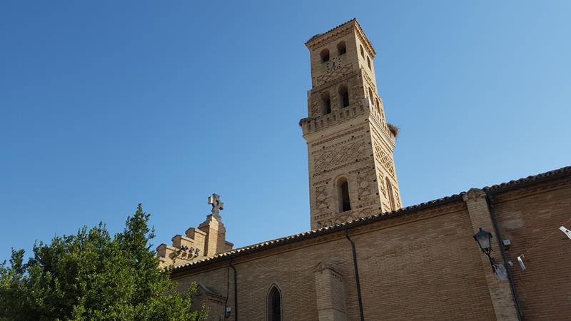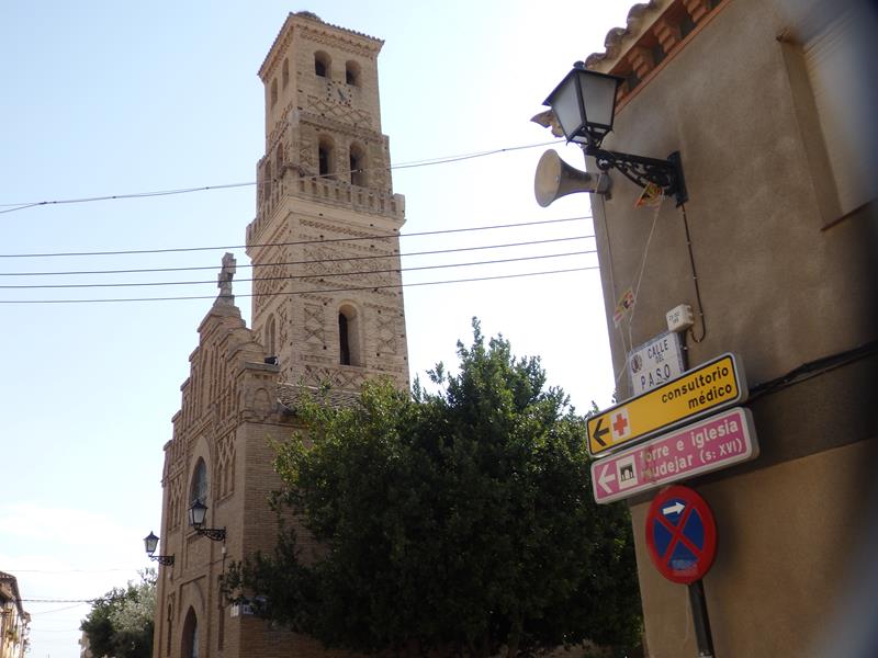 Sigo callejeando y llego a una pequeña fuente, en lo que parece una plaza. Las calles, una tras otra, siguen vacías. Finalmente llego hasta la zona de la iglesia,que luce su torre, de estilo mudéjar. La iglesia es la de Nuestra Señora de los Ángeles. El conjunto formado por el templo y la torre es producto de tres etapas constructivas en ladrillo que abarcan desde el siglo XIV hasta el XX.
